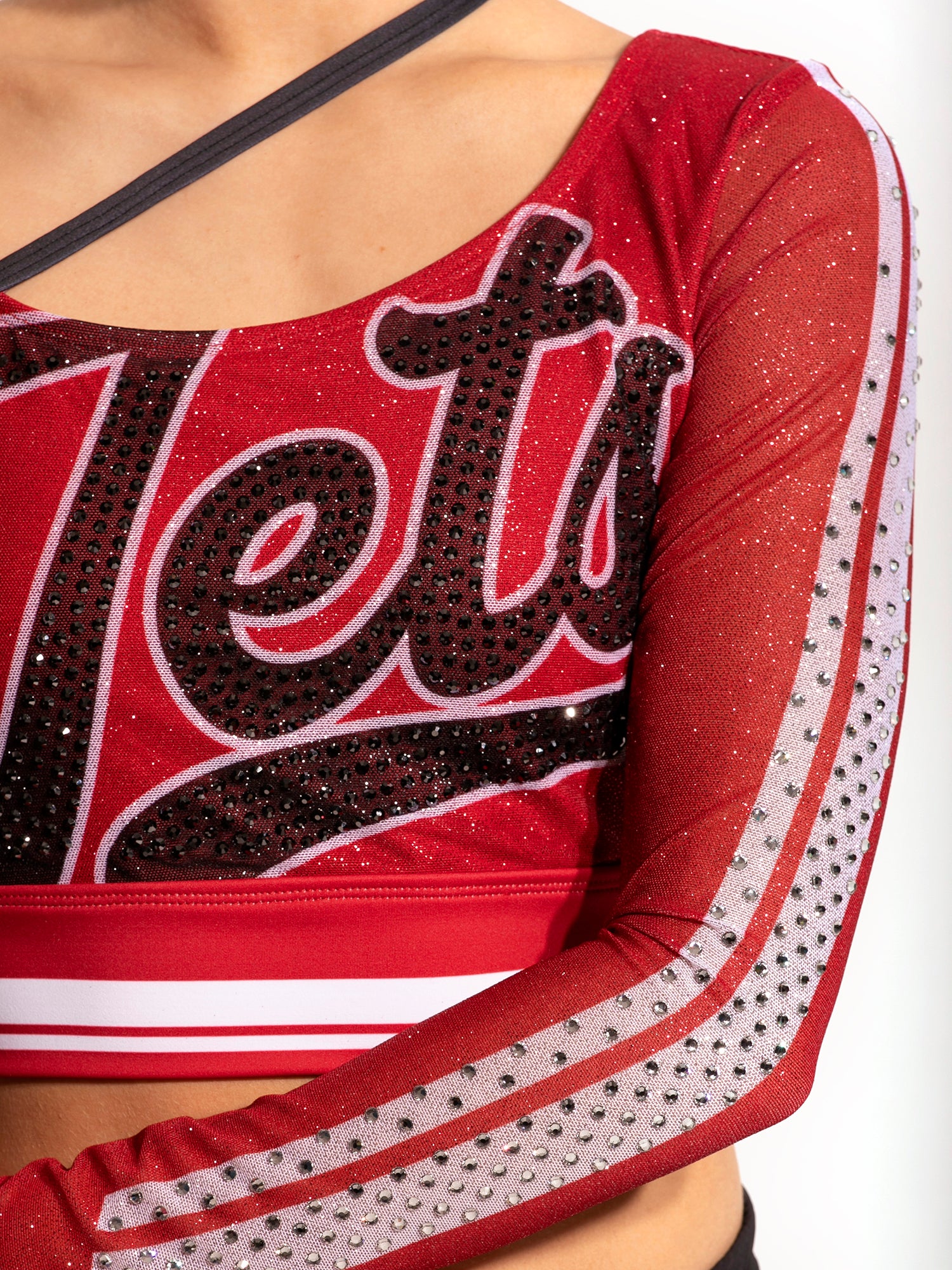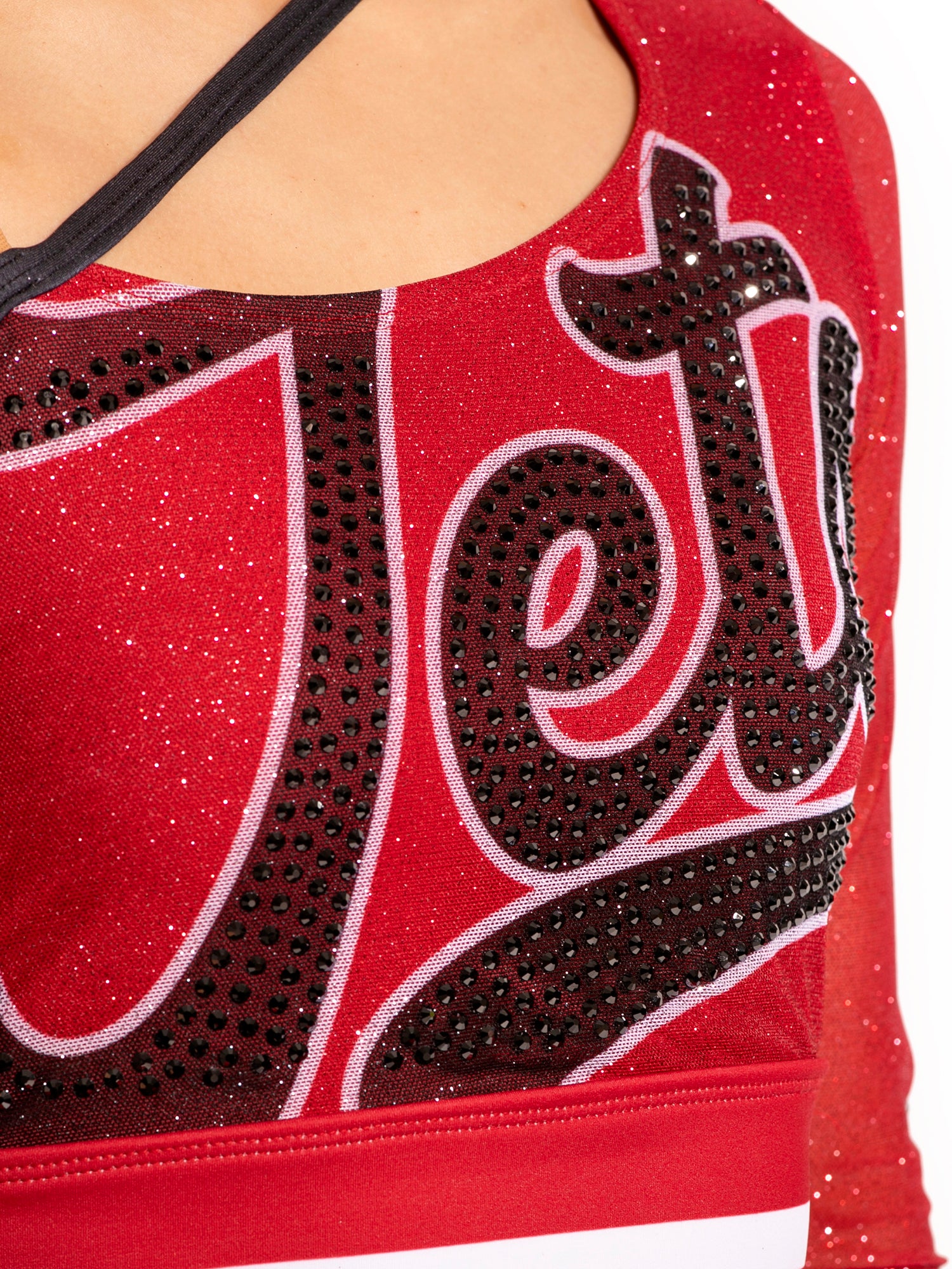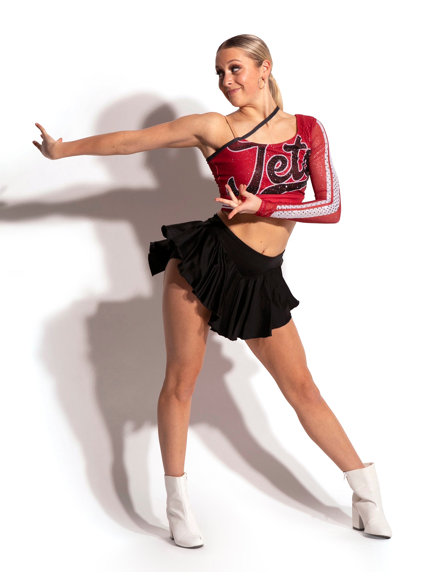 PLEASE NOTE: The fabric design of this garment is created using a unique process called dye sublimation. Sublimation is a great design solution. However, minor inconsistencies and imperfections are a part of the nature of the dye sublimation process and are to be expected. This includes slight color differences and small blemishes. Glitter finish may dull and shed over time and with use. For high friction choreography and extended use of garments, we recommend alternative fabric options.