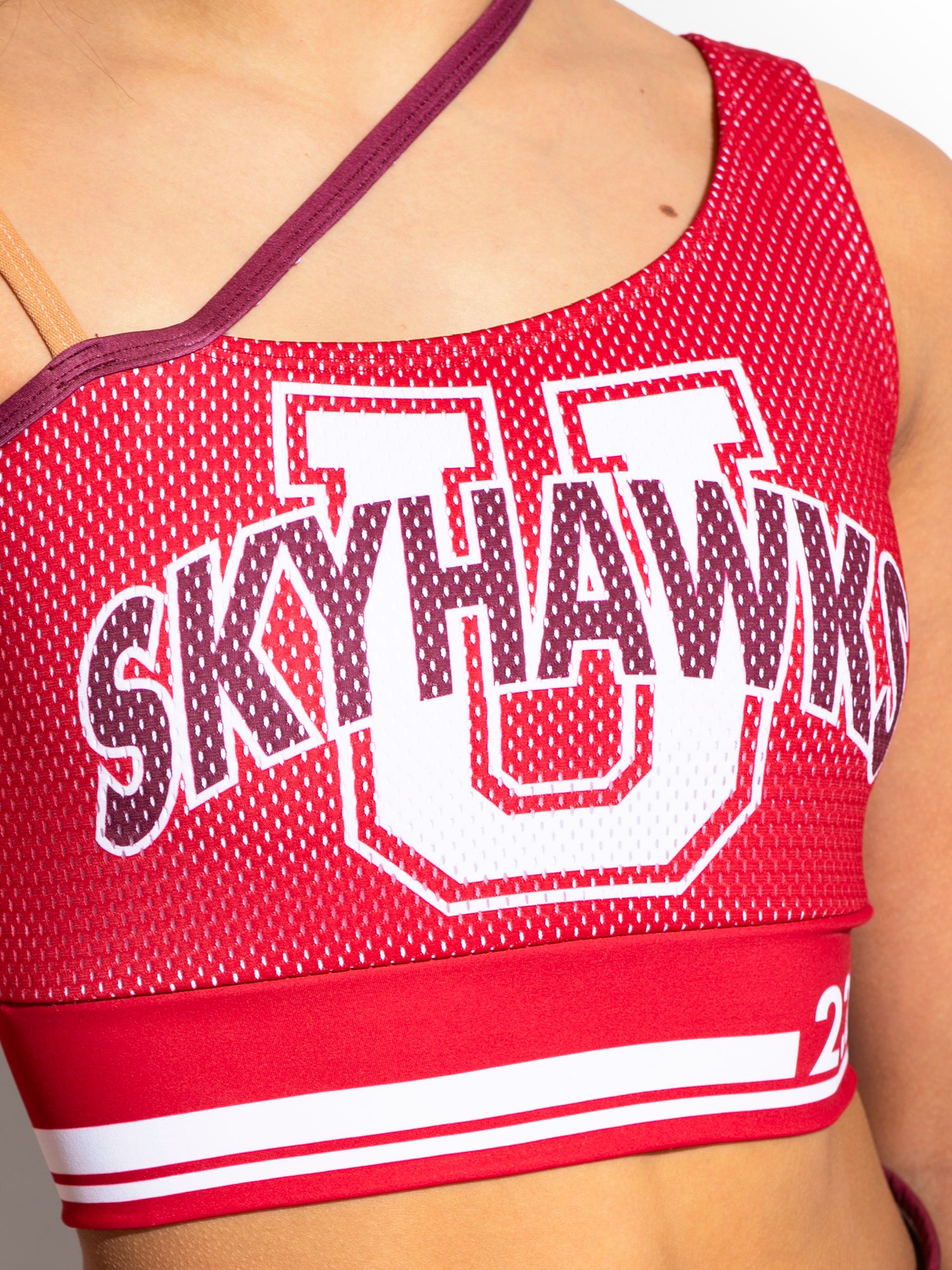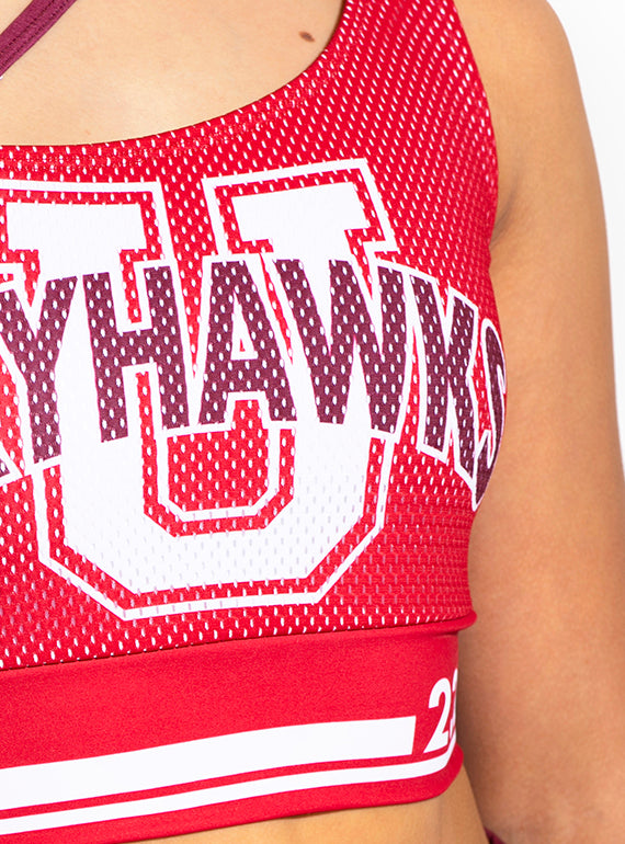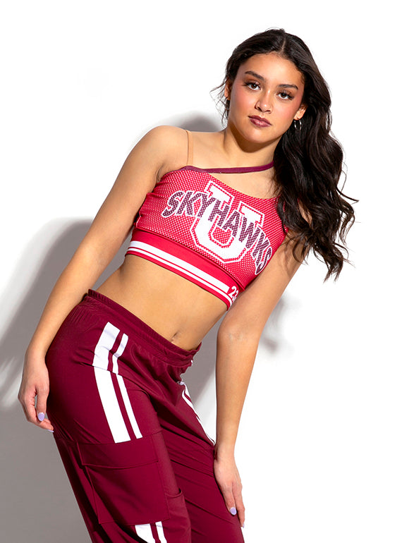 - Sublimated asymmetrical long line crop top in athletic mesh, with strappy details and lettering