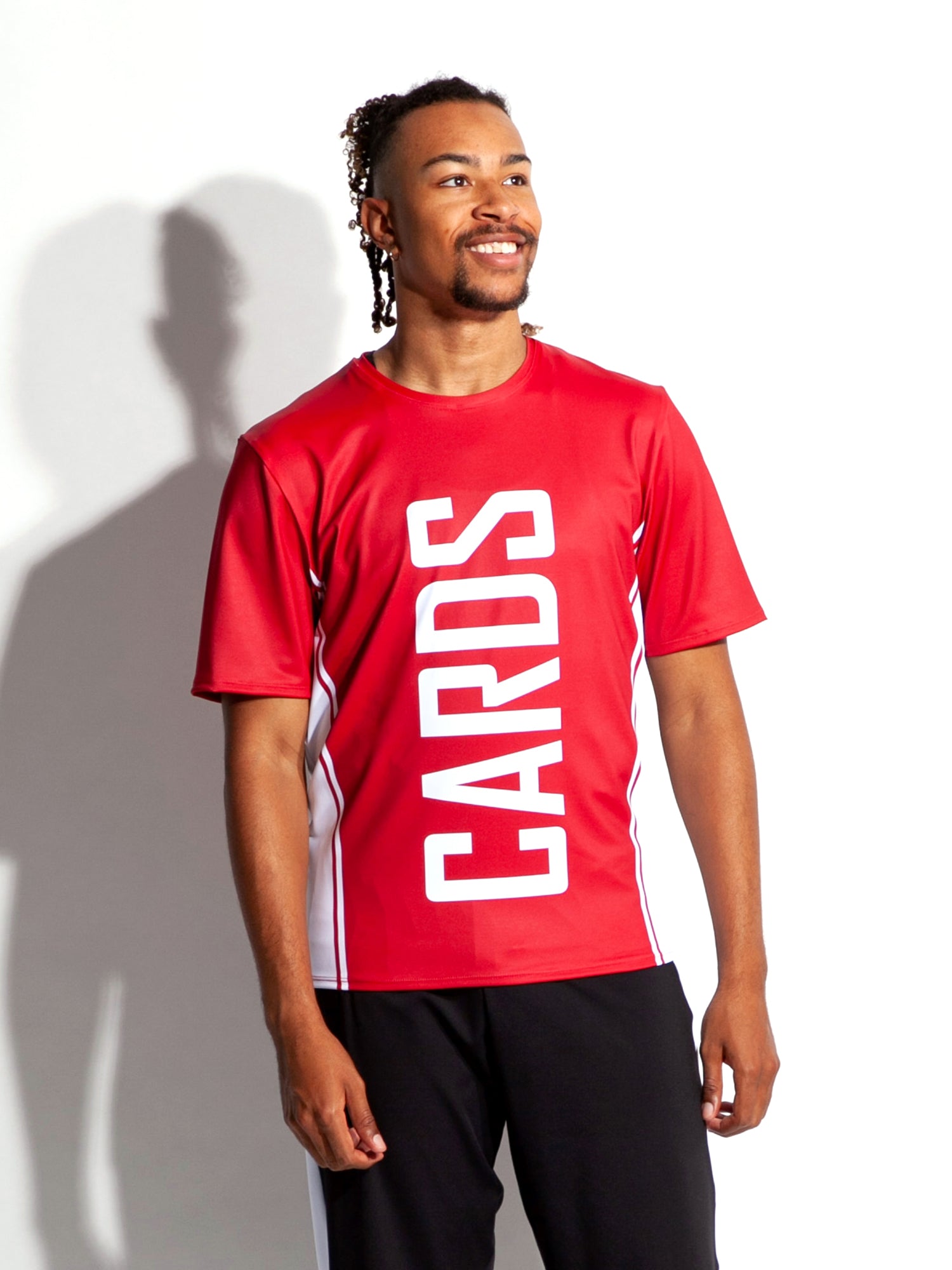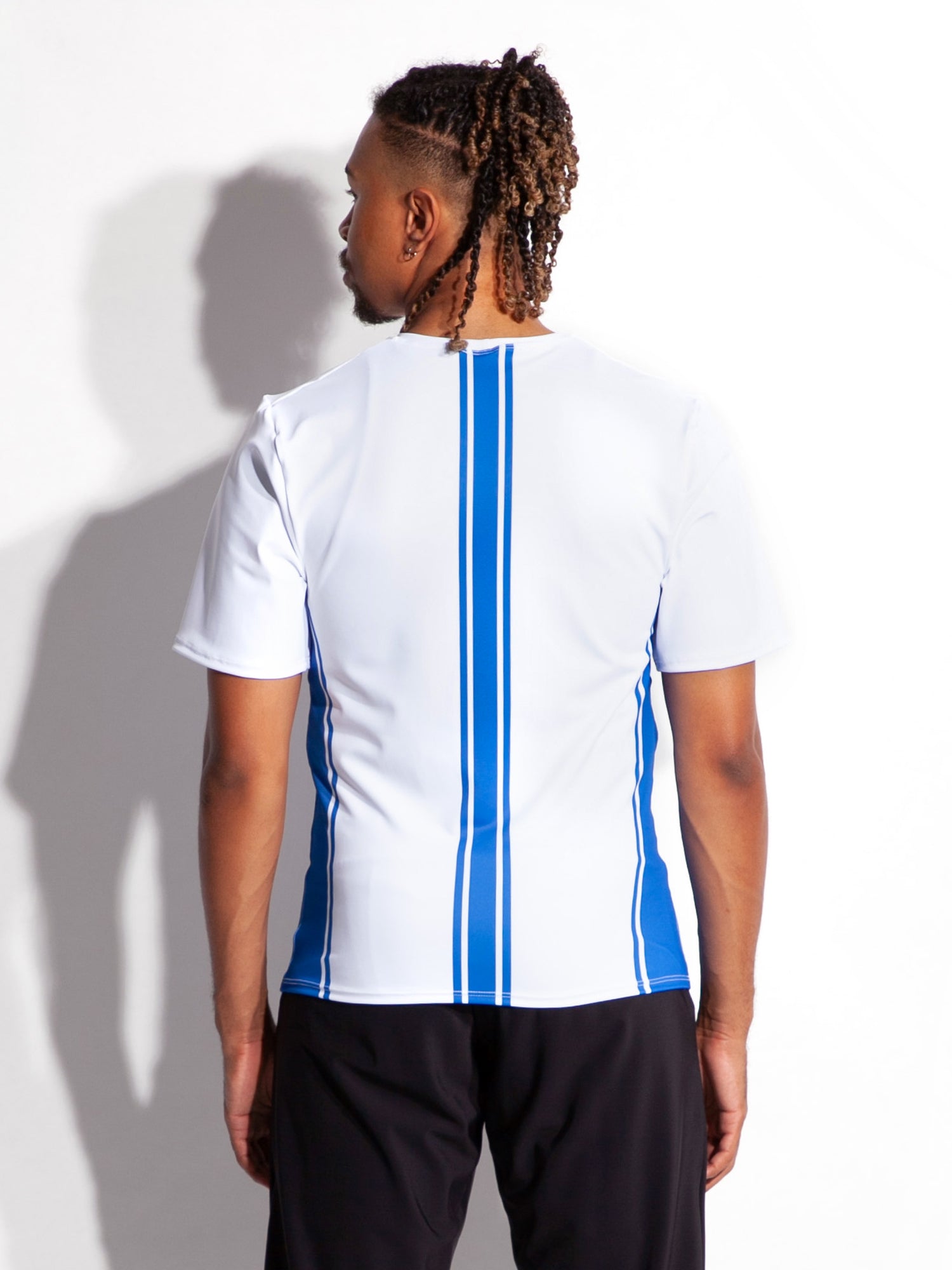 - Sublimated crew neck shirt with side stripe accents and short sleeves