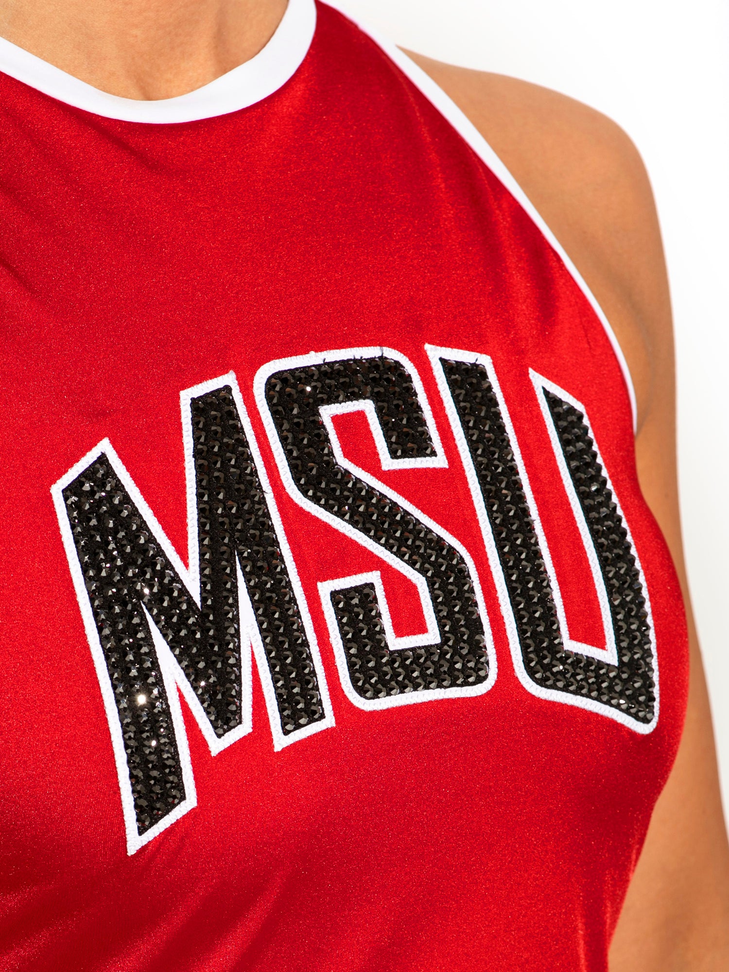 - Sporty game day dress with high crew neck, pop mesh racerback, and side stripe blocking