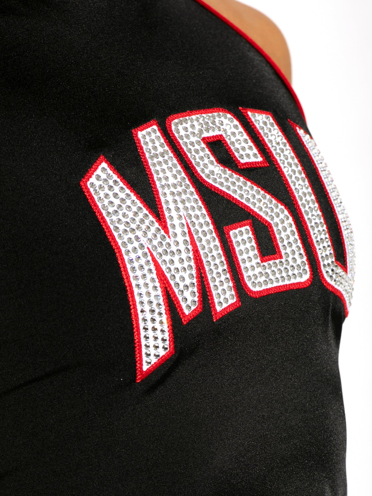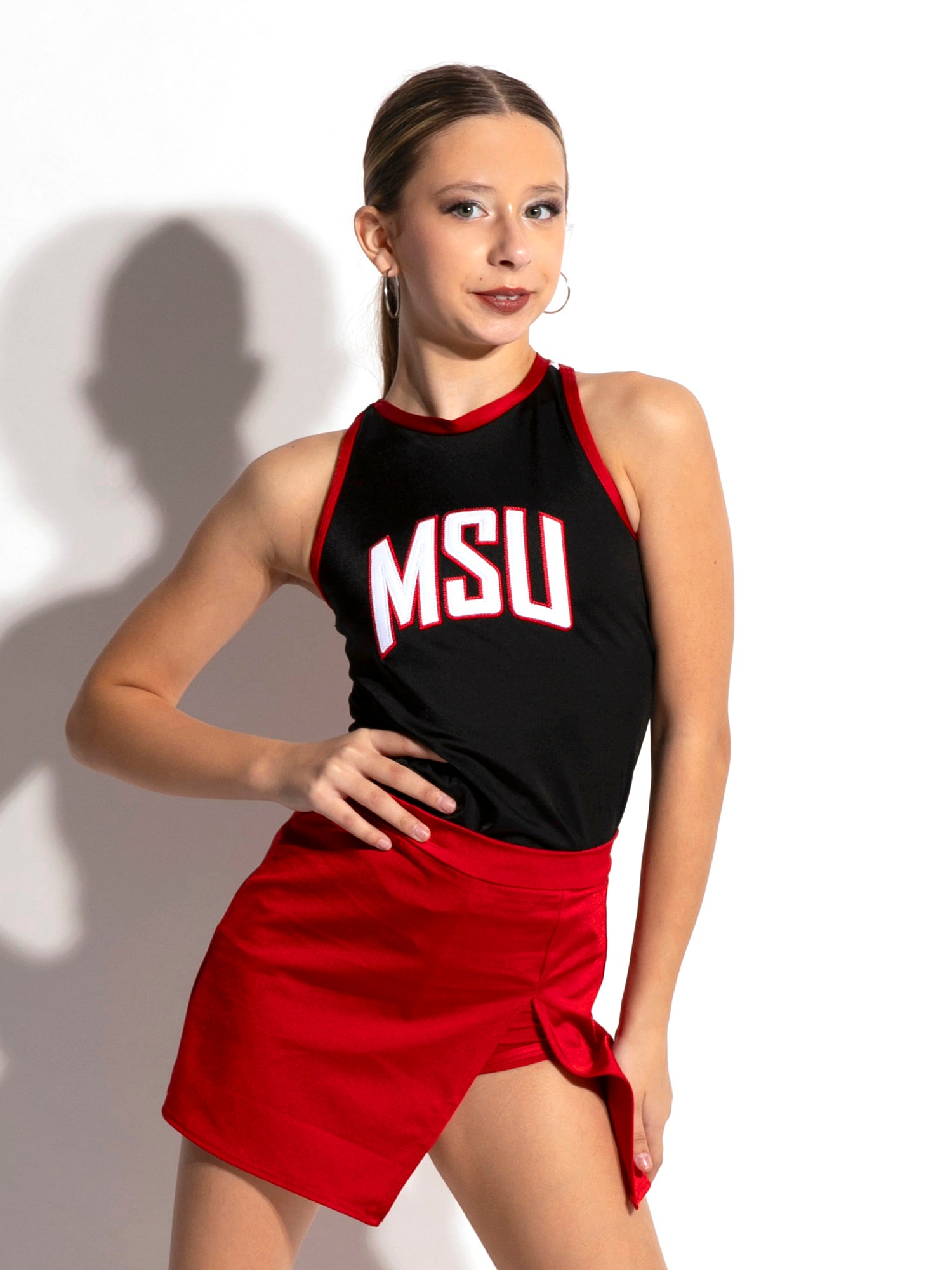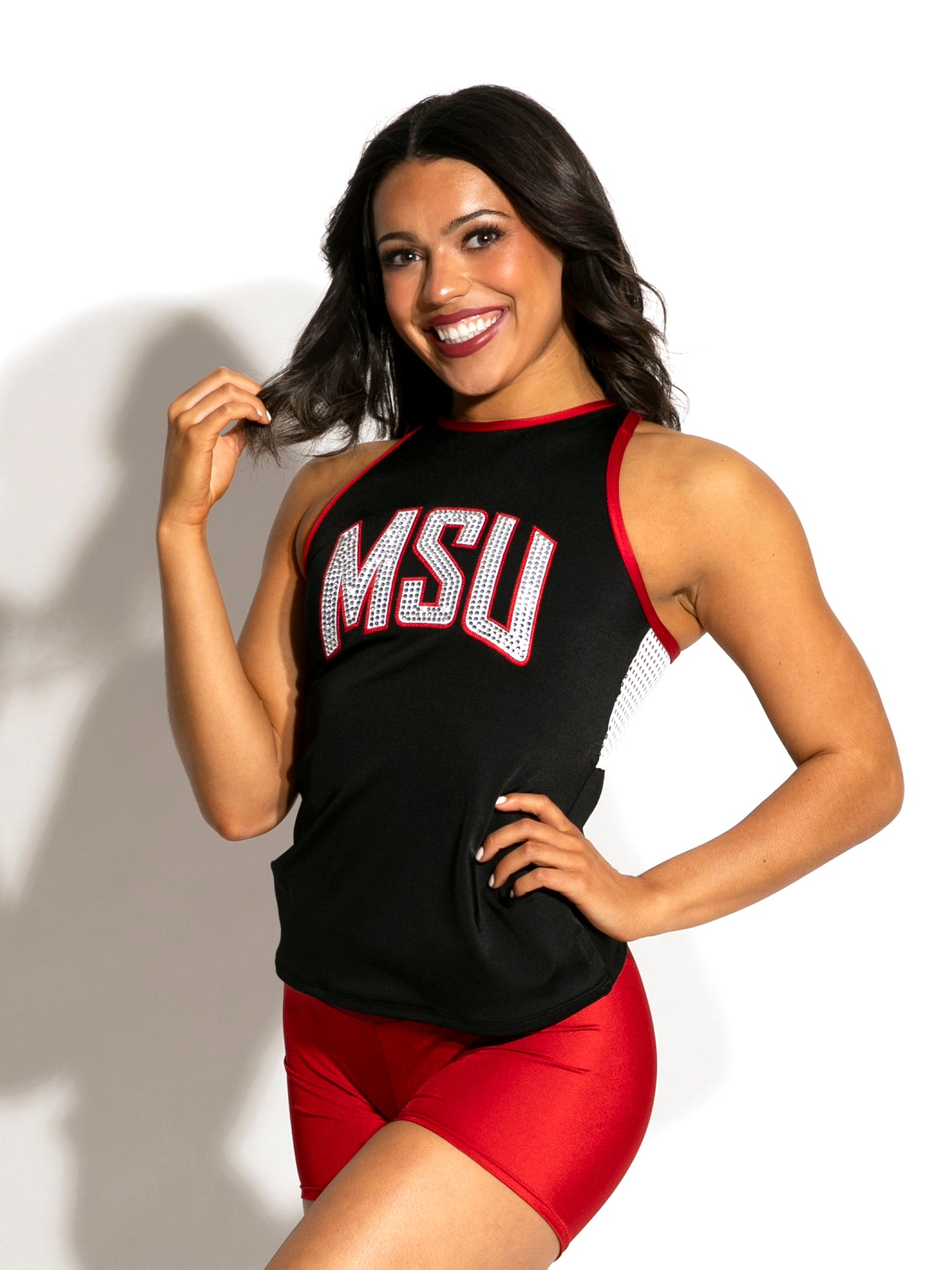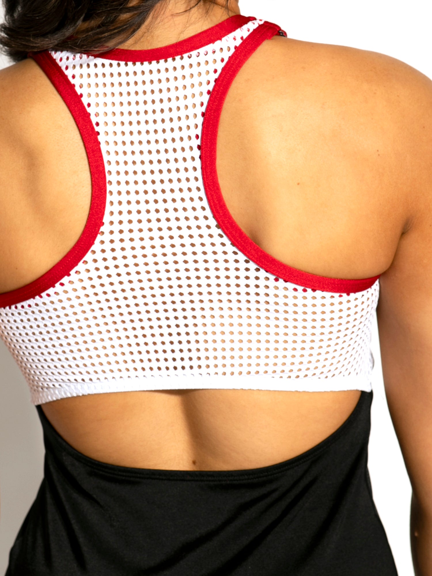 - Sporty gameday tank with high crew neck and pop mesh racerback