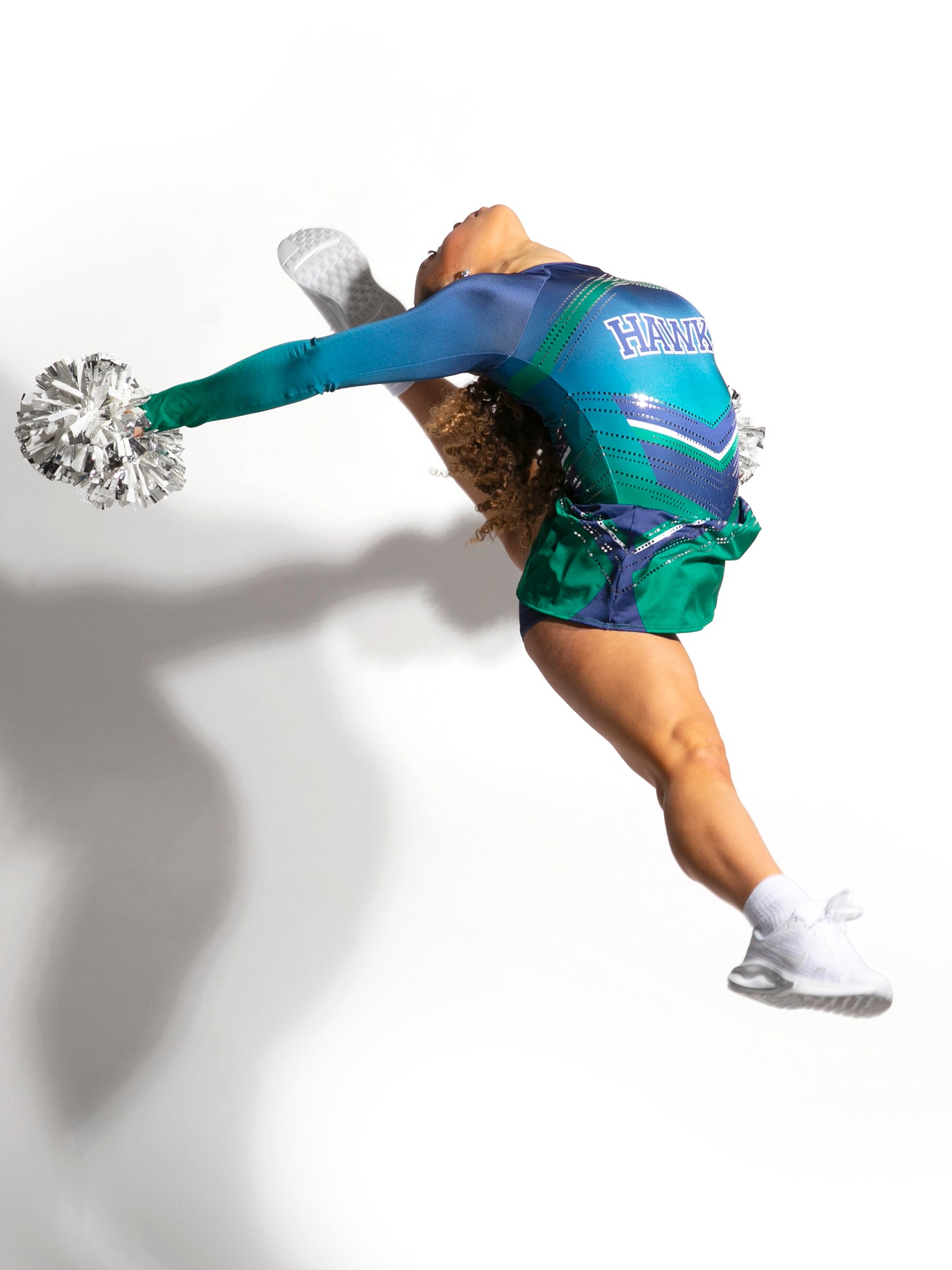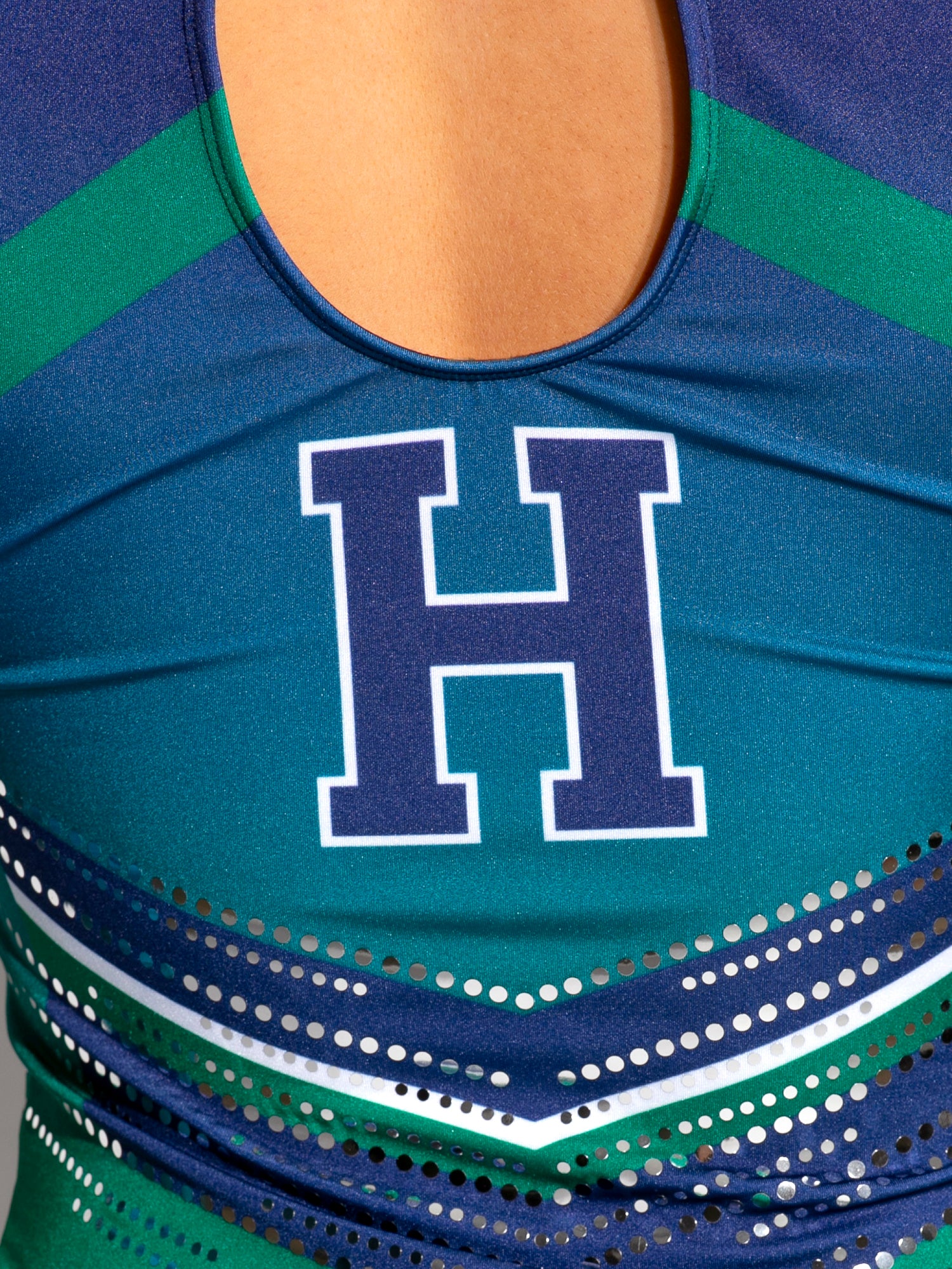 - Striking fully sublimated pom dress with lettering and add on spangles
