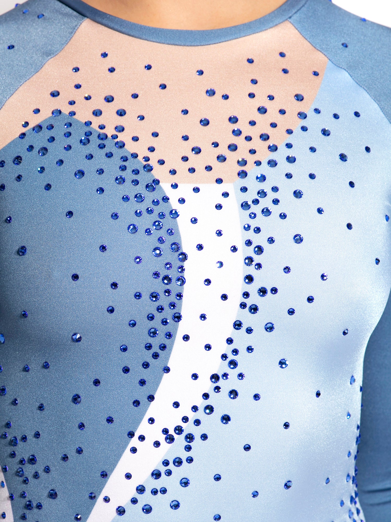 - Fully sublimated long sleeve leotard with an asymmetrical print and add on rhinestones