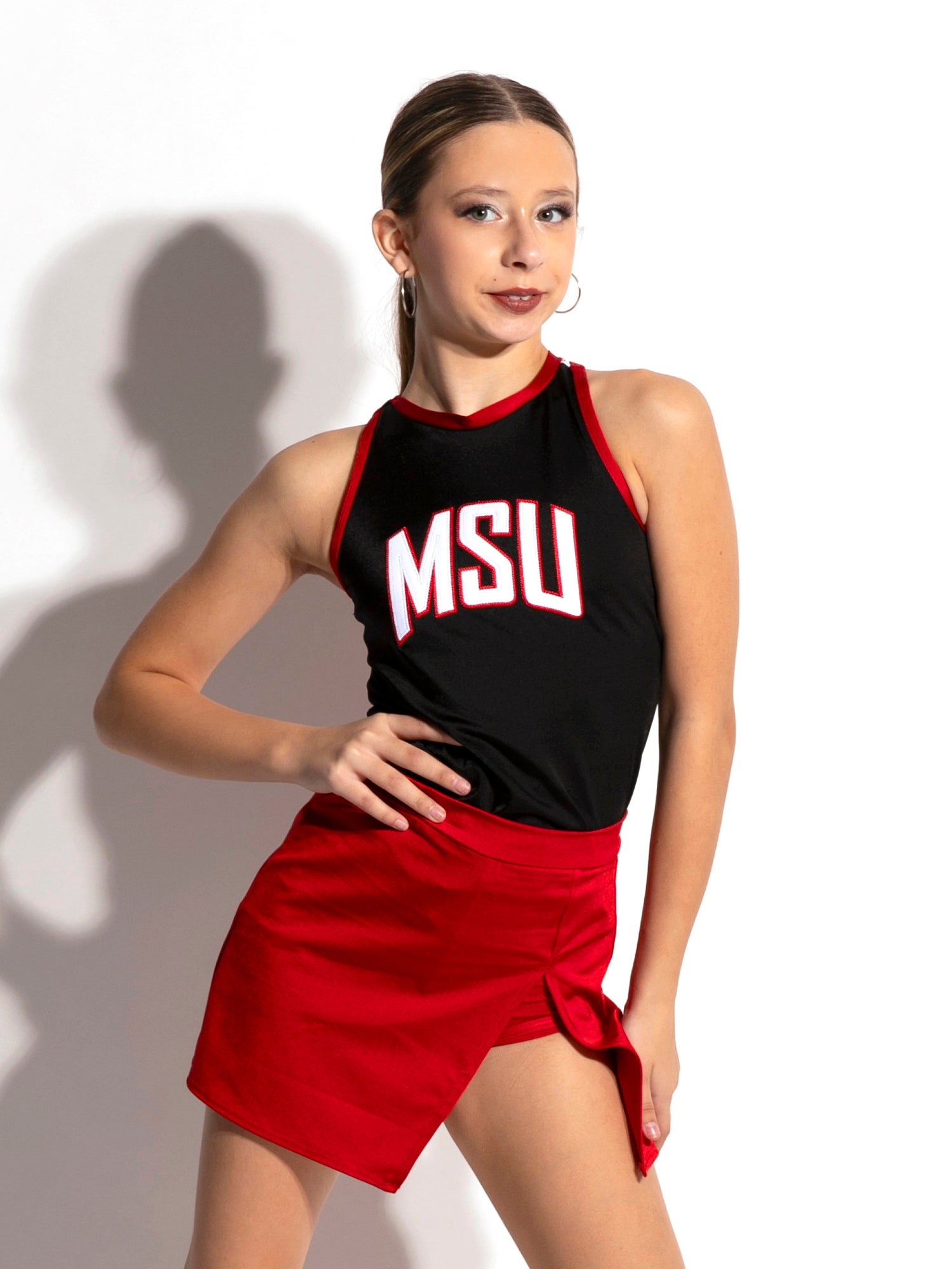 - Classic cheer skirt with wide thigh vent that reveals attached boyshort