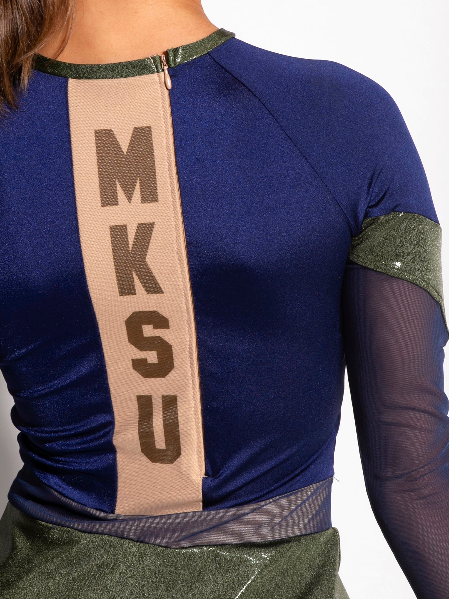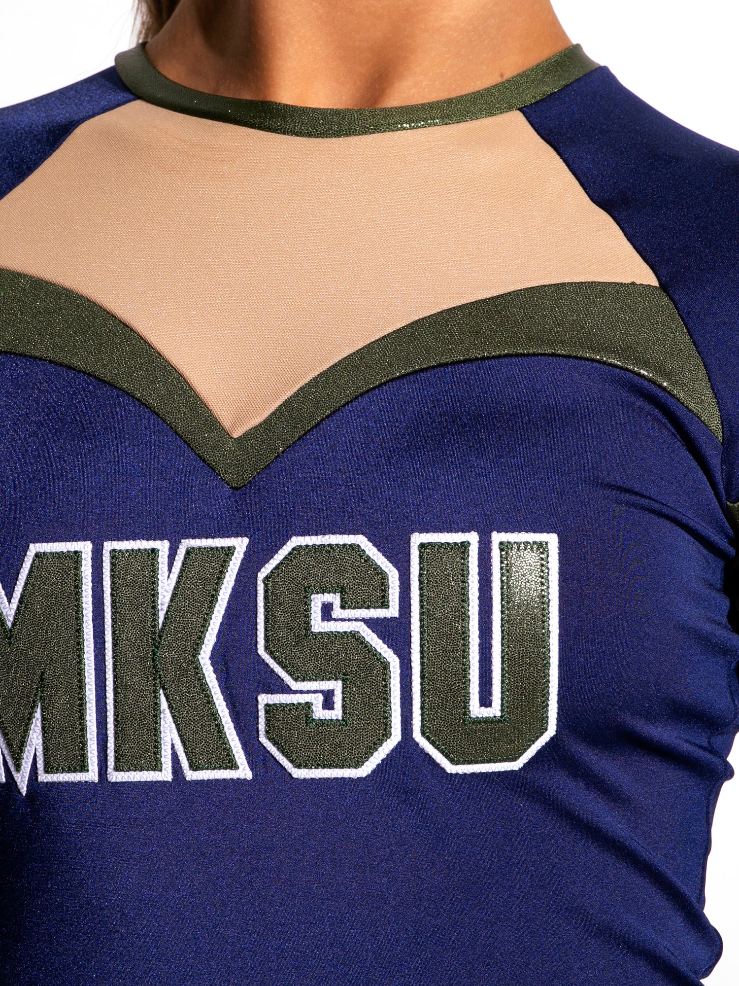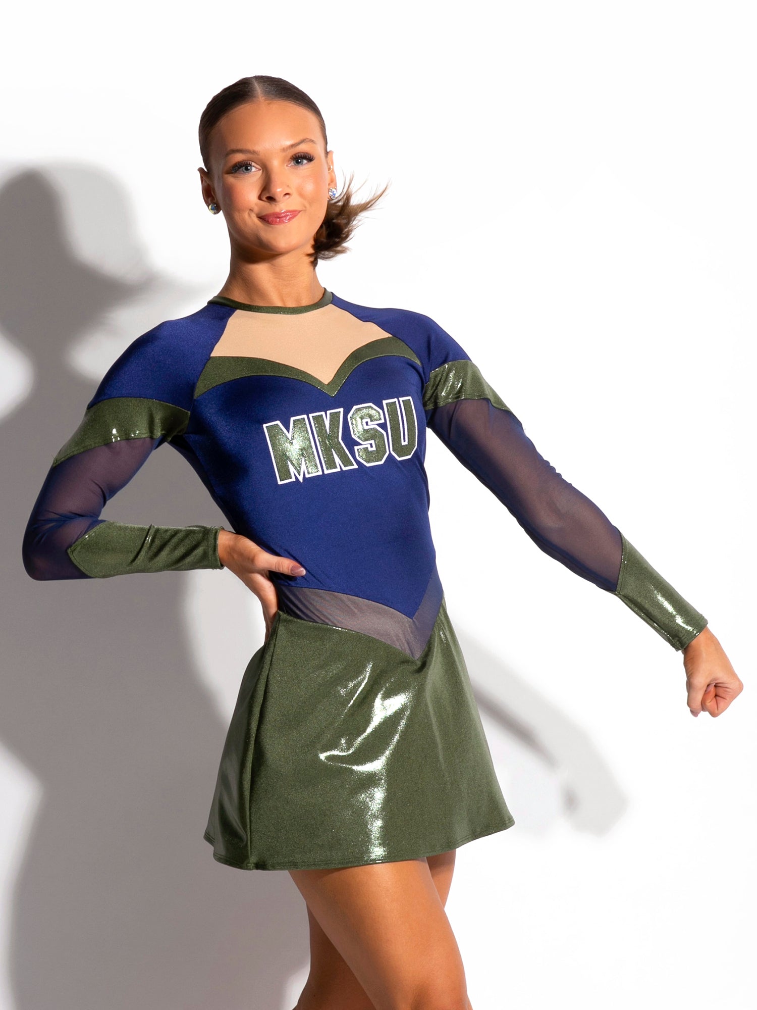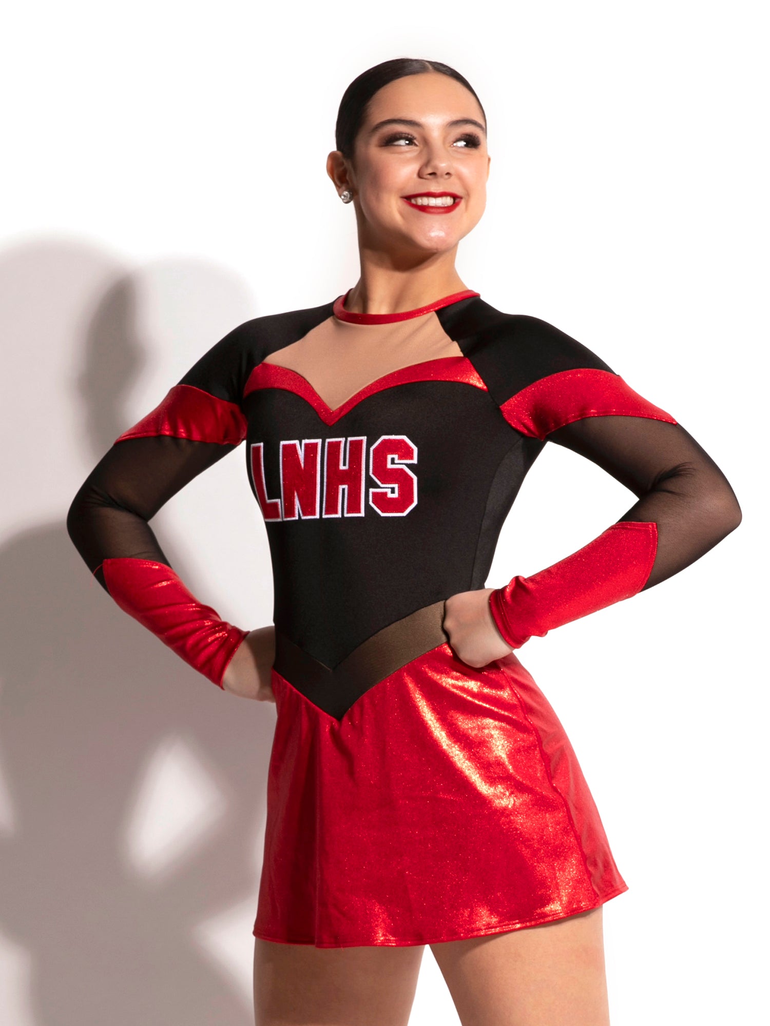 - Pom dress with sweetheart neckline, mesh blocking, and back lettering