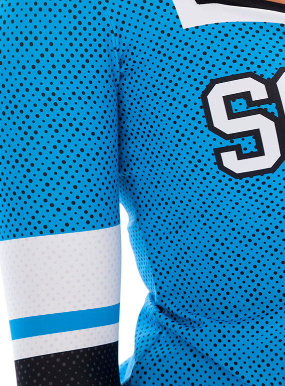 - Fully sublimated hockey dress with a sweetheart neckline and an attached leotard