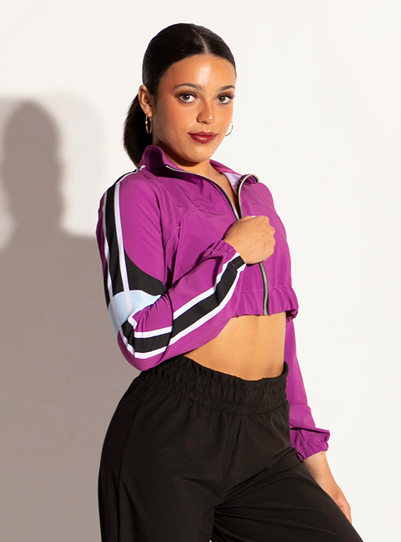 - Fully sublimated striped mock neck cropped jacket with exposed zipper and pockets
