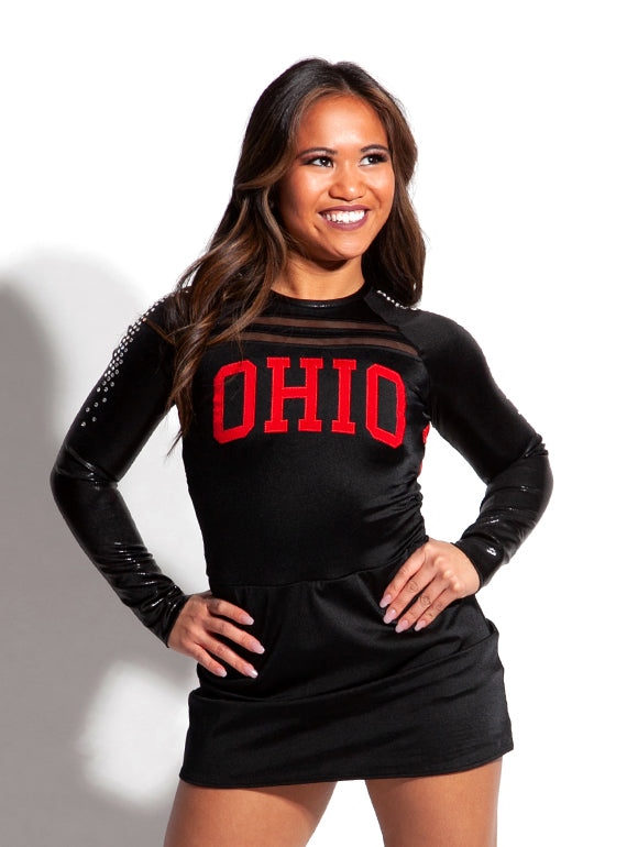 - Edgy pom dress with contrast sleeves and open back inspired by the Ohio State University’s 2021 pom dress