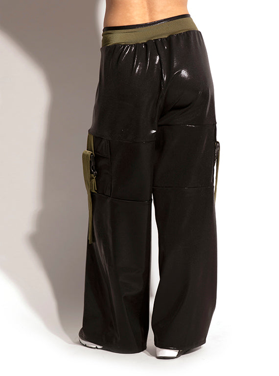 - Cargo style hip hop hologram pants with blocked waistband, buckle details and faux pockets
