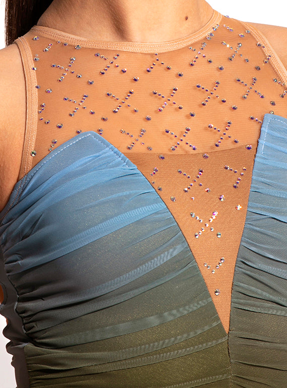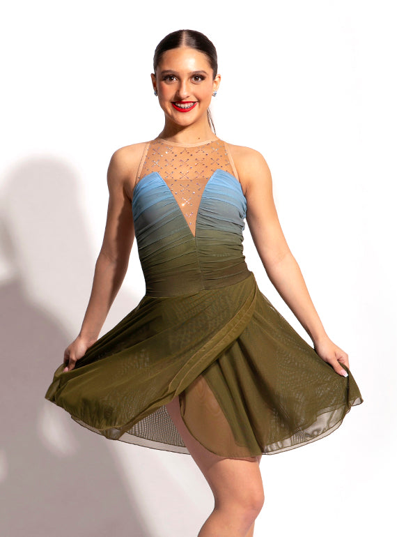 - Fairytale skate dress with gathered bodice and illusion high neck with a sublimated ombre