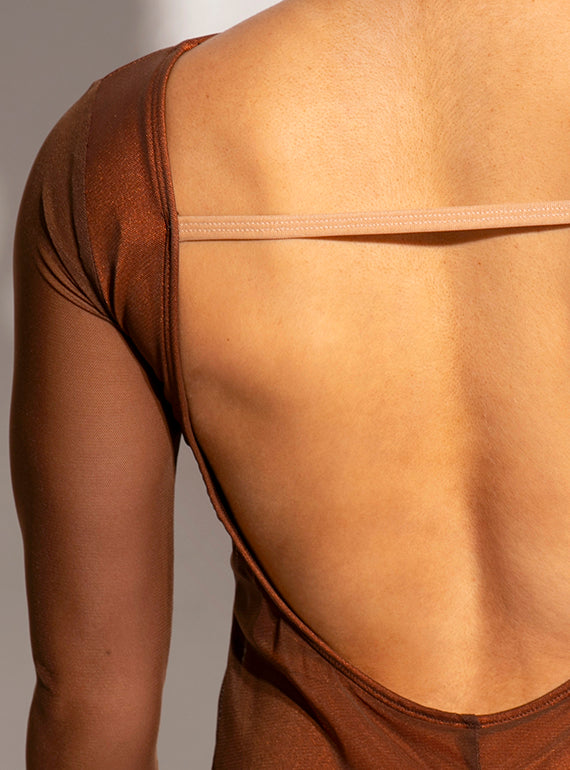 - Long sleeve contemporary mesh dress with boat neck, plunging open back, and side slits