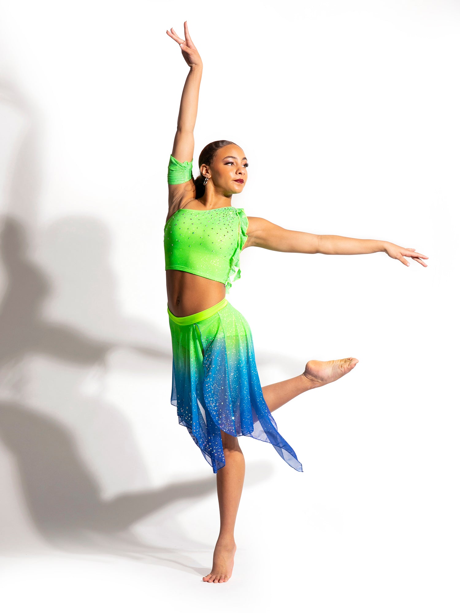 PLEASE NOTE: The fabric design of this garment is created using a unique process called dye sublimation. Sublimation is a great design solution. However, minor inconsistencies and imperfections are a part of the nature of the dye sublimation process and are to be expected. This includes slight color differences and small blemishes. Glitter finish may dull and shed over time and with use. For high friction choreography and extended use of garments, we recommend alternative fabric options.