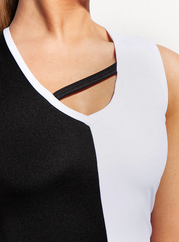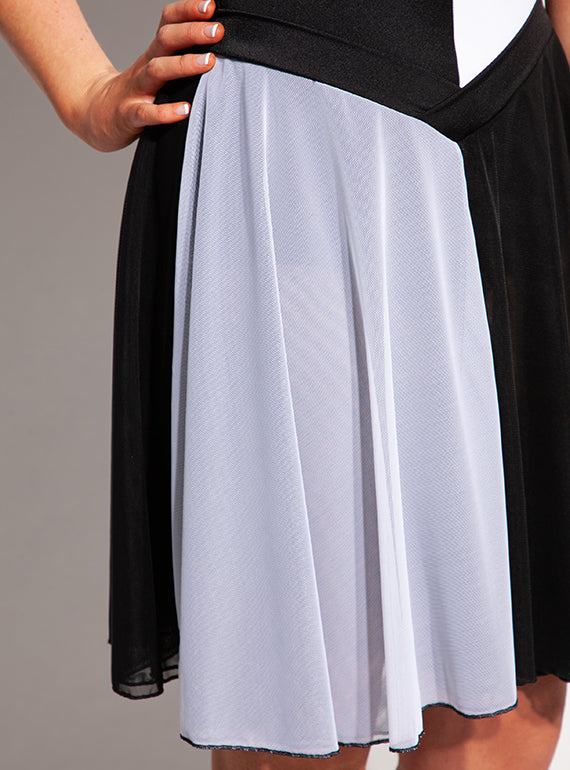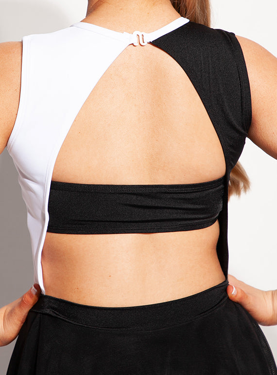 - Two-tone skate dress with an open back & a 2-layer mesh skirt