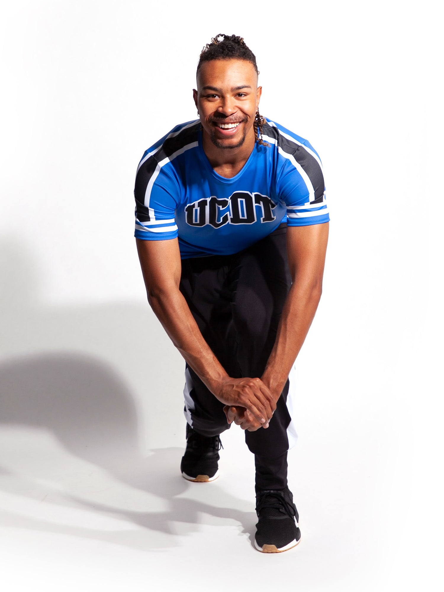- Crew neck t-shirt with sublimated color blocking & lettering
