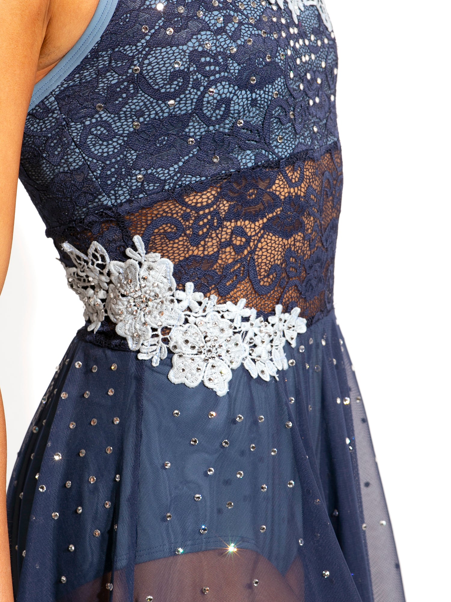 - Flirty v-neck lace strappy tank dress with appliques and add on rhinestones