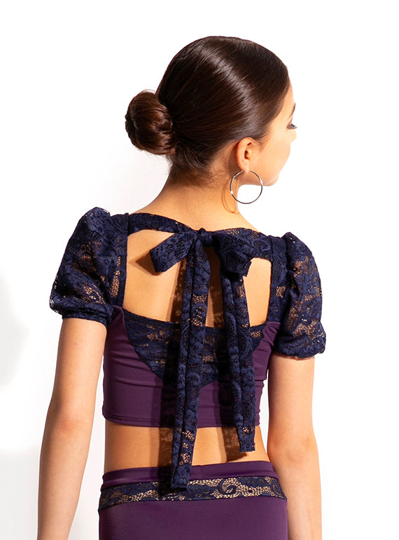- Ruched bandeau crop with princess seams and puff lace sleeves
