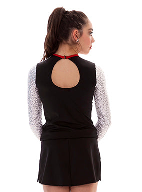 - Fitted hip length top with triangular peek-a-boo opening in the front and a back keyhole with a clasp