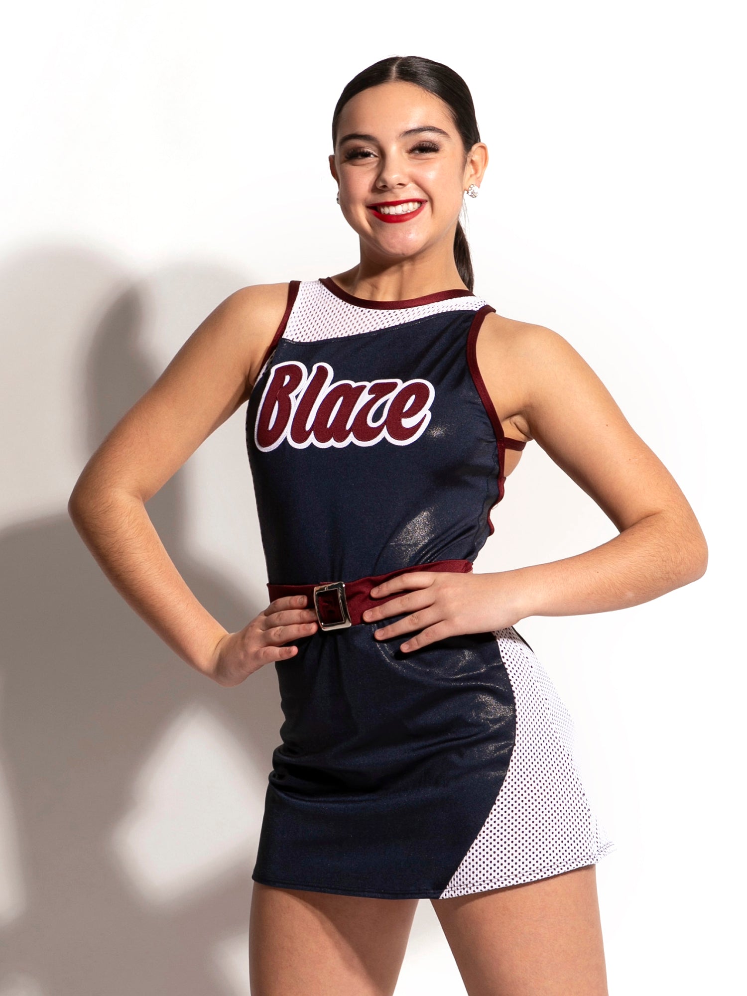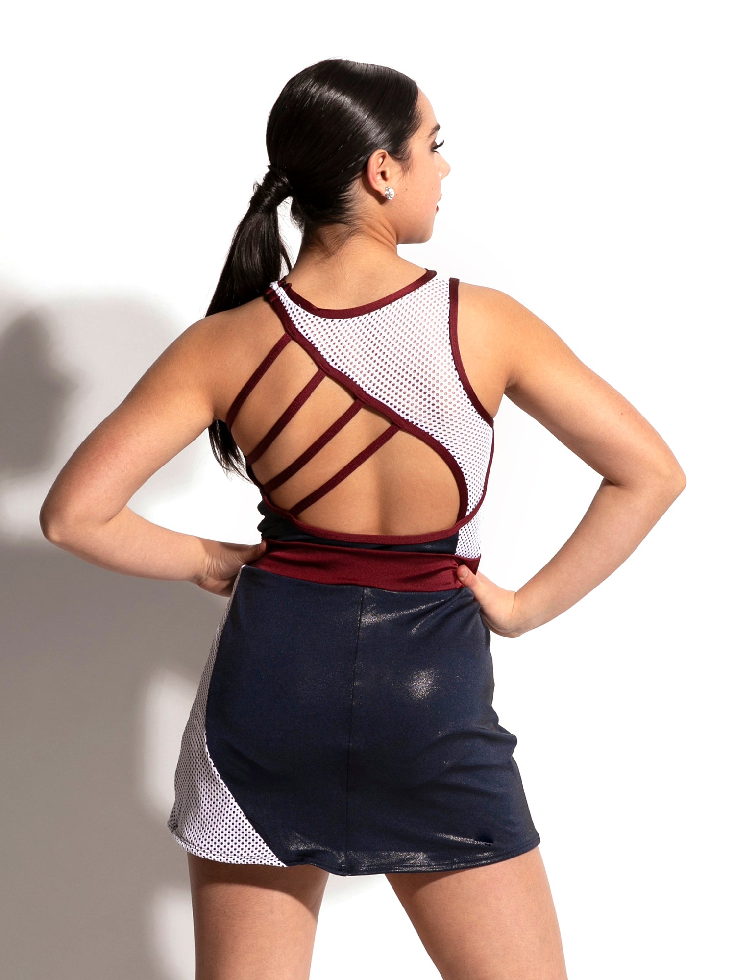 - Sleeveless gameday myst dress with pop mesh details and add on embroidery lettering