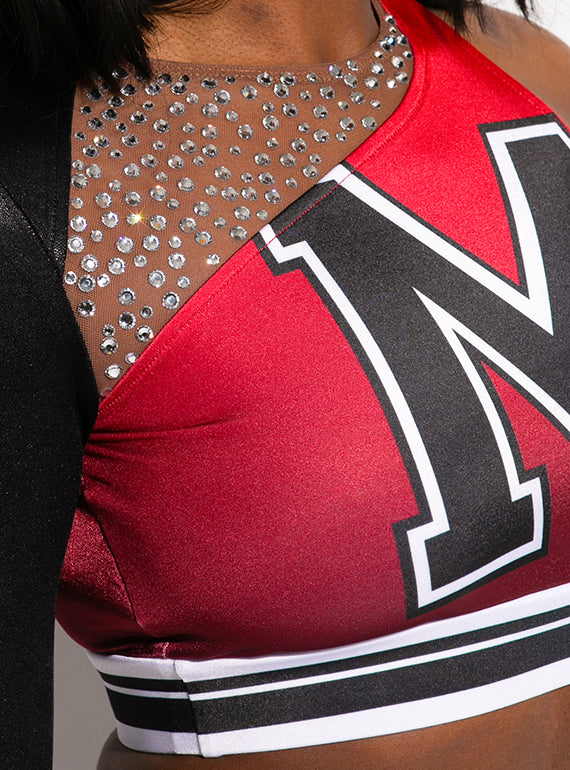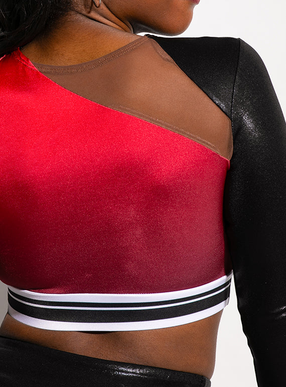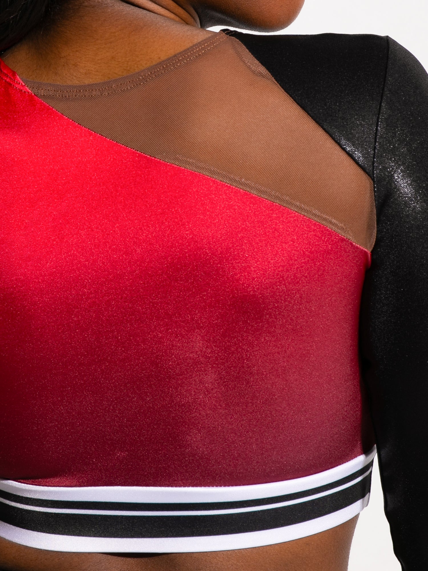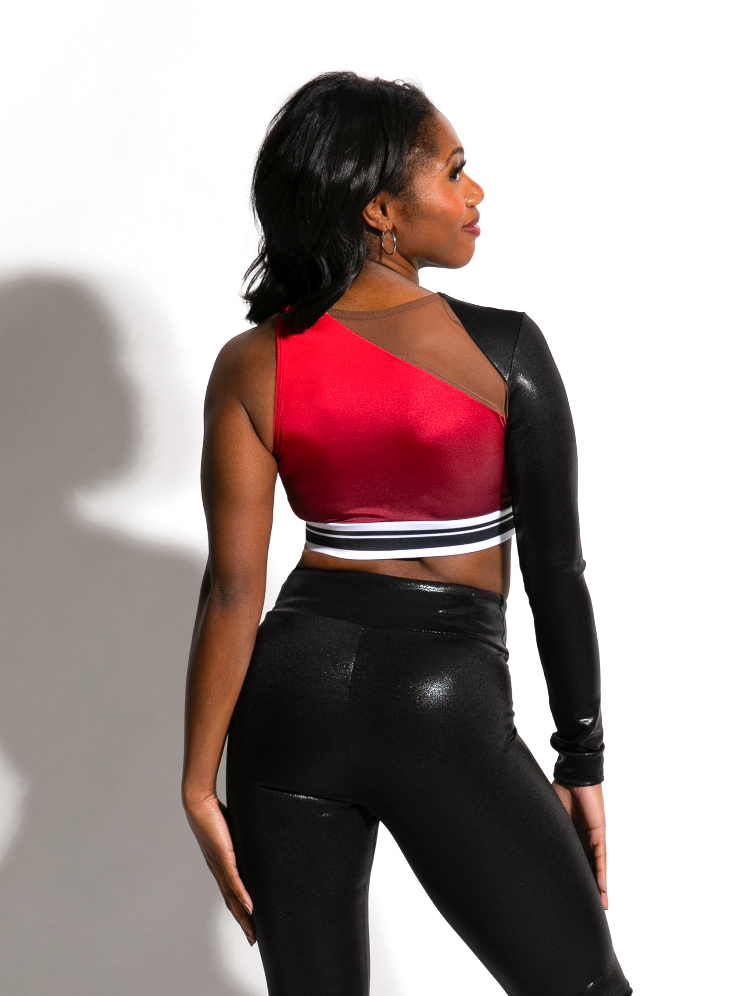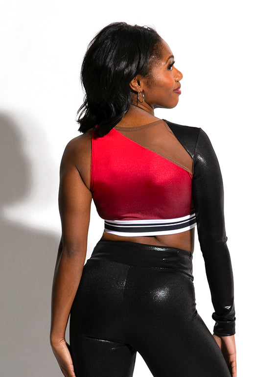 - Single sleeve sporty sublimated crop top perfect for gameday
