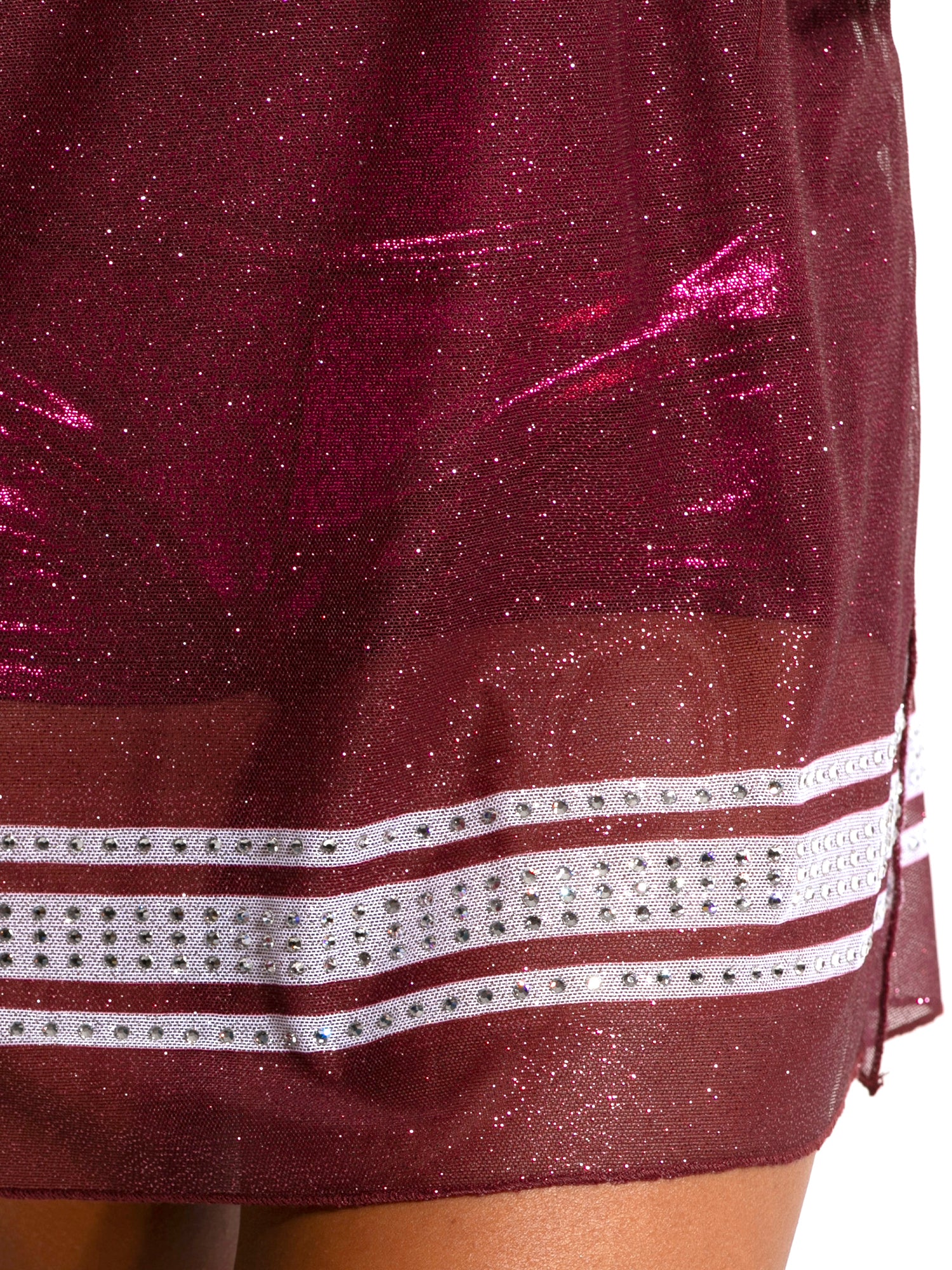 PLEASE NOTE: The fabric design of this garment is created using a unique process called dye sublimation. Sublimation is a great design solution. However, minor inconsistencies and imperfections are a part of the nature of the dye sublimation process and are to be expected. This includes slight color differences and small blemishes. Glitter finish may dull and shed over time and with use. For high friction choreography and extended use of garments, we recommend alternative fabric options.