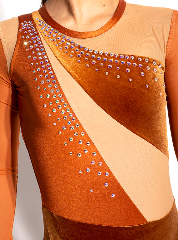 - Jazzy asymmetrical long-sleeved leotard with mesh, tricot, and velvet blocking and velvet brief