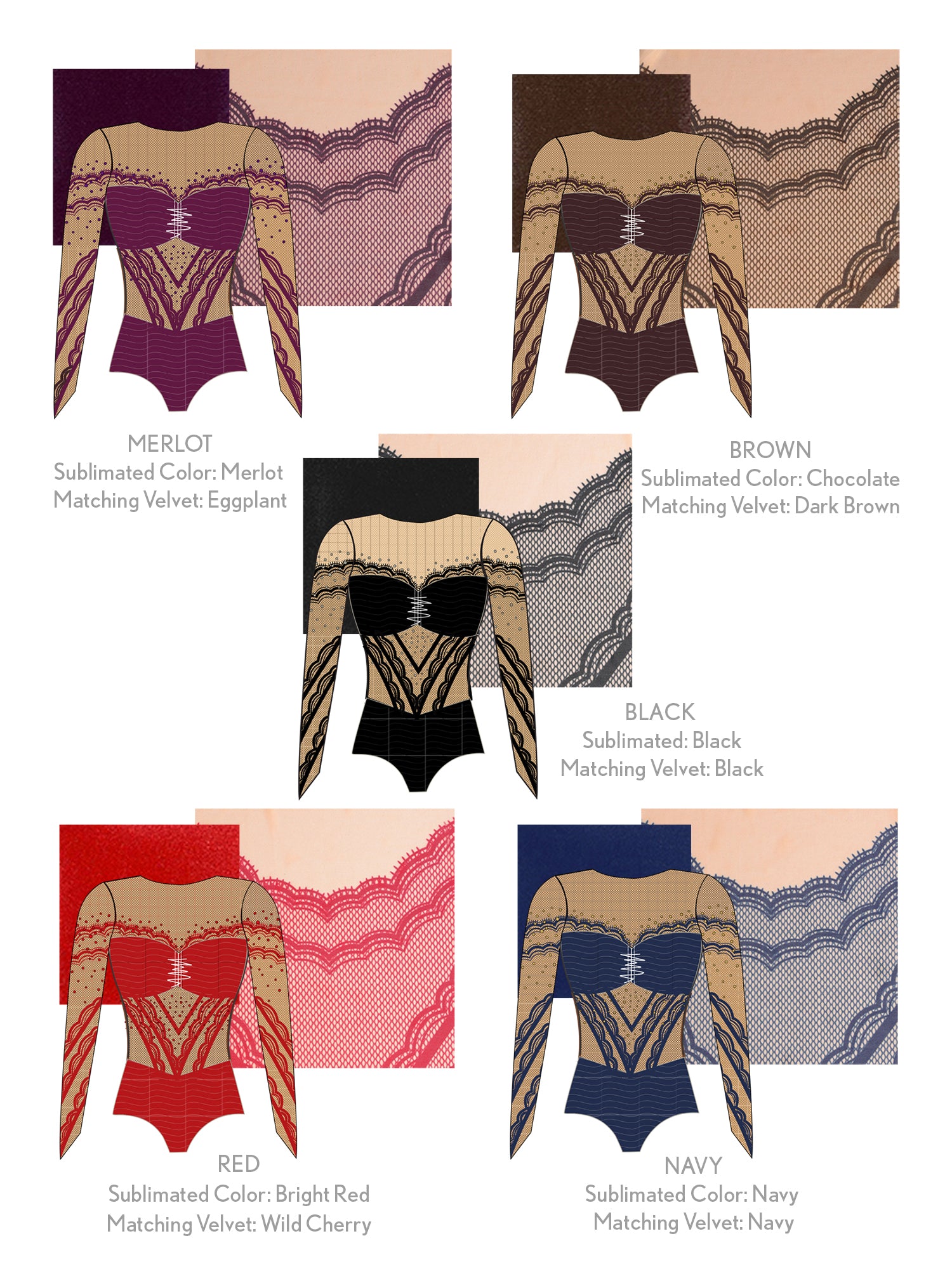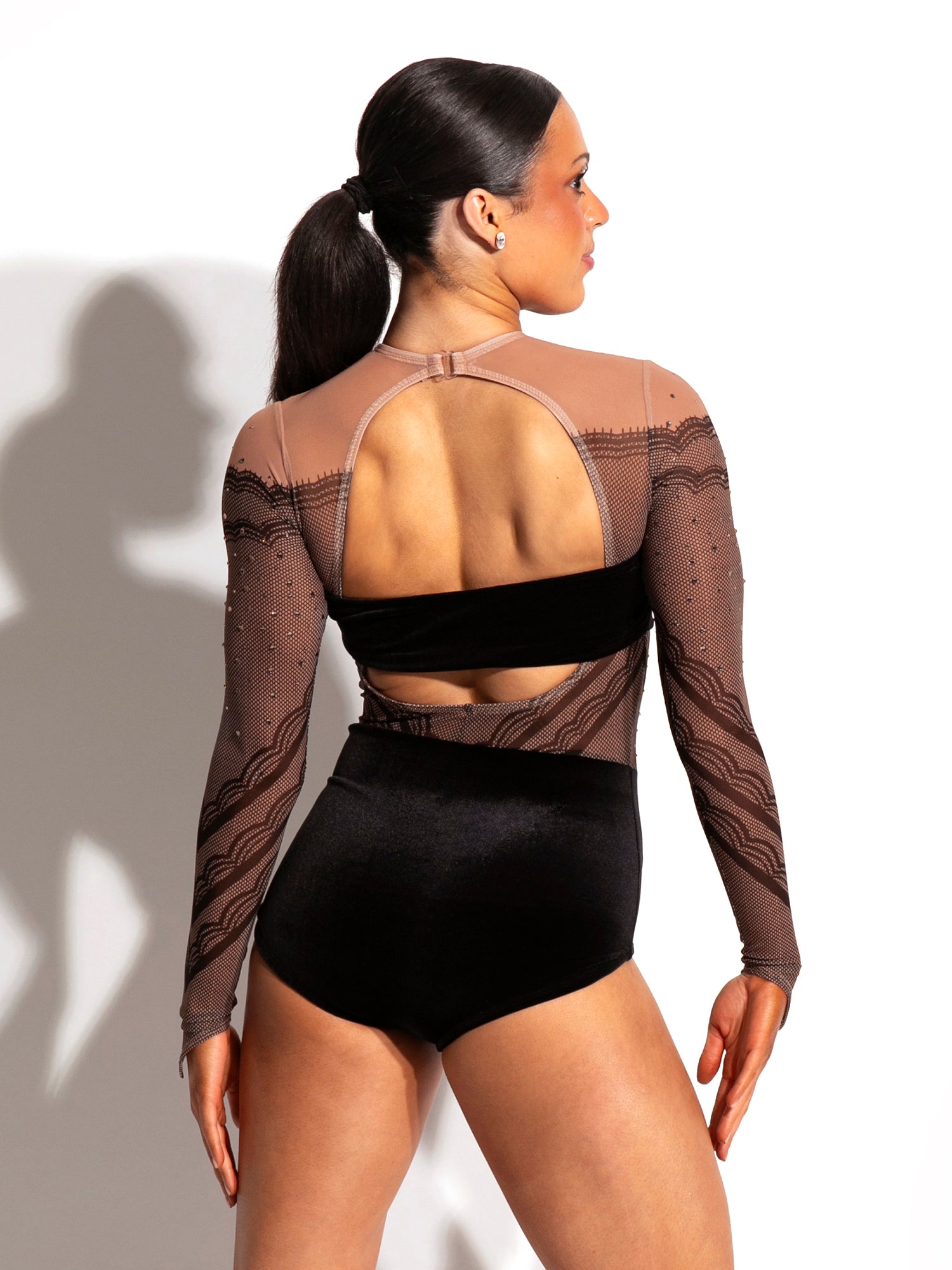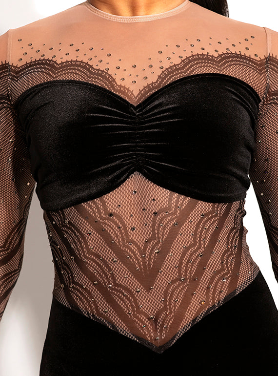 - Elegant long sleeve sublimated lace print leotard with velvet details and add on rhinestones