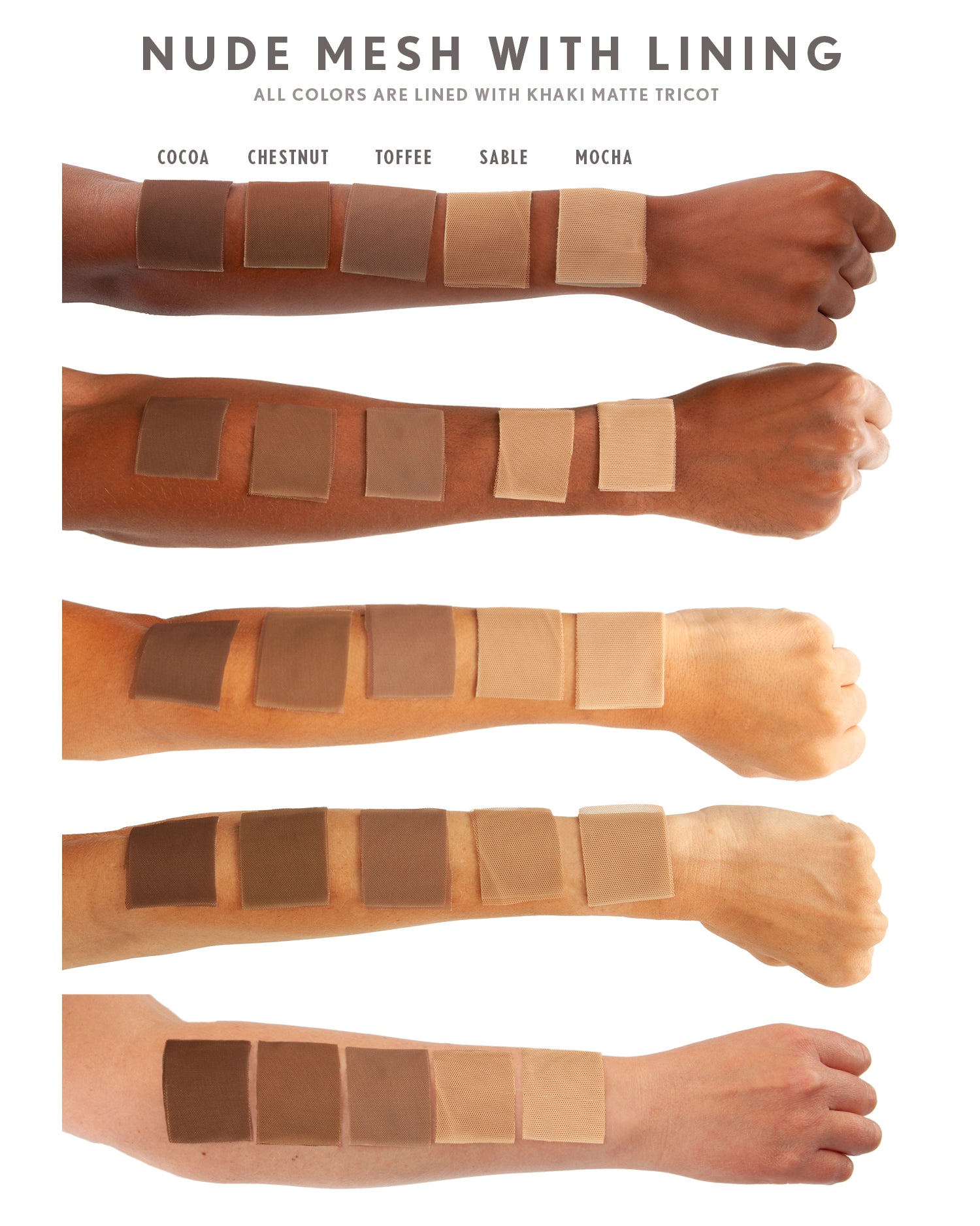About Nude Lining: Nude lining colors are typically available under nude or color mesh. Click here to view swatch examples of nude lining options on different skin tones both with and without mesh.