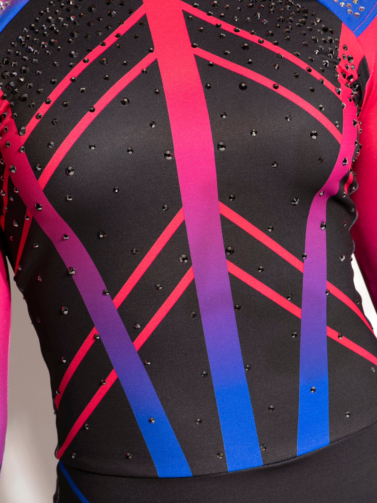 - Striking futuristic sublimated high neck long sleeve leotard with strong shoulders and add on rhinestones