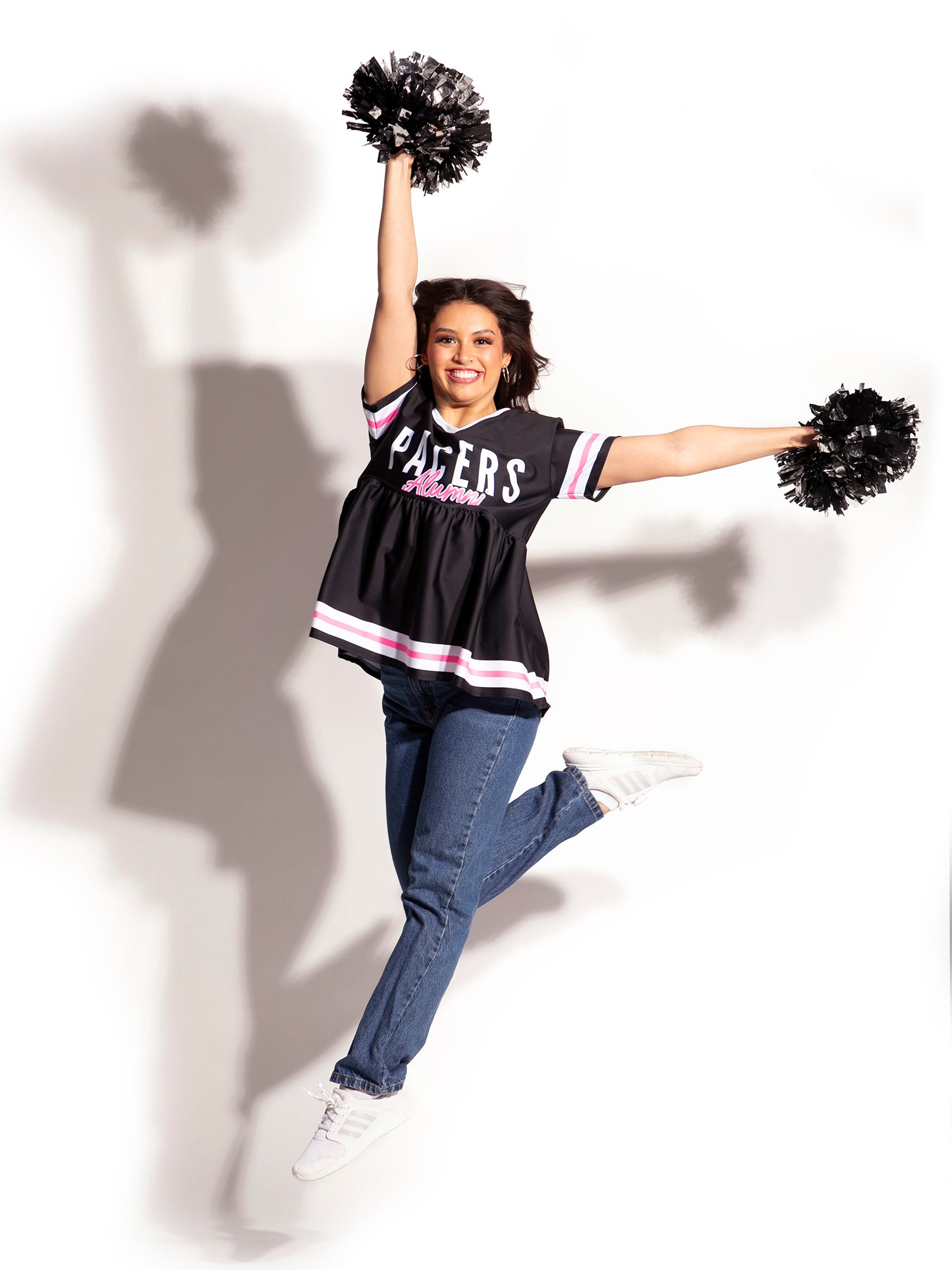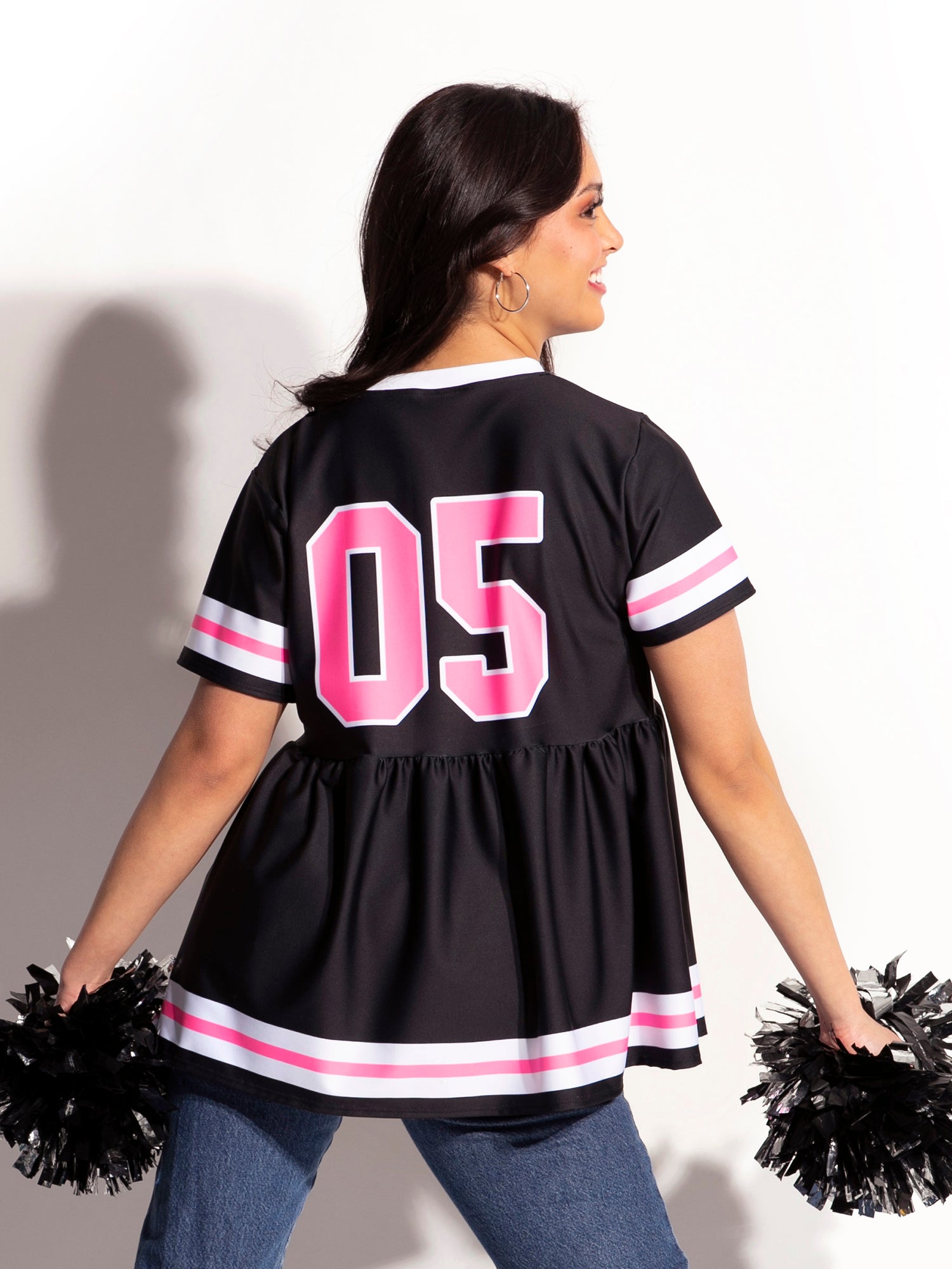 - Fully sublimated loose fit V-neck top with gathers at waist made in dri stretch