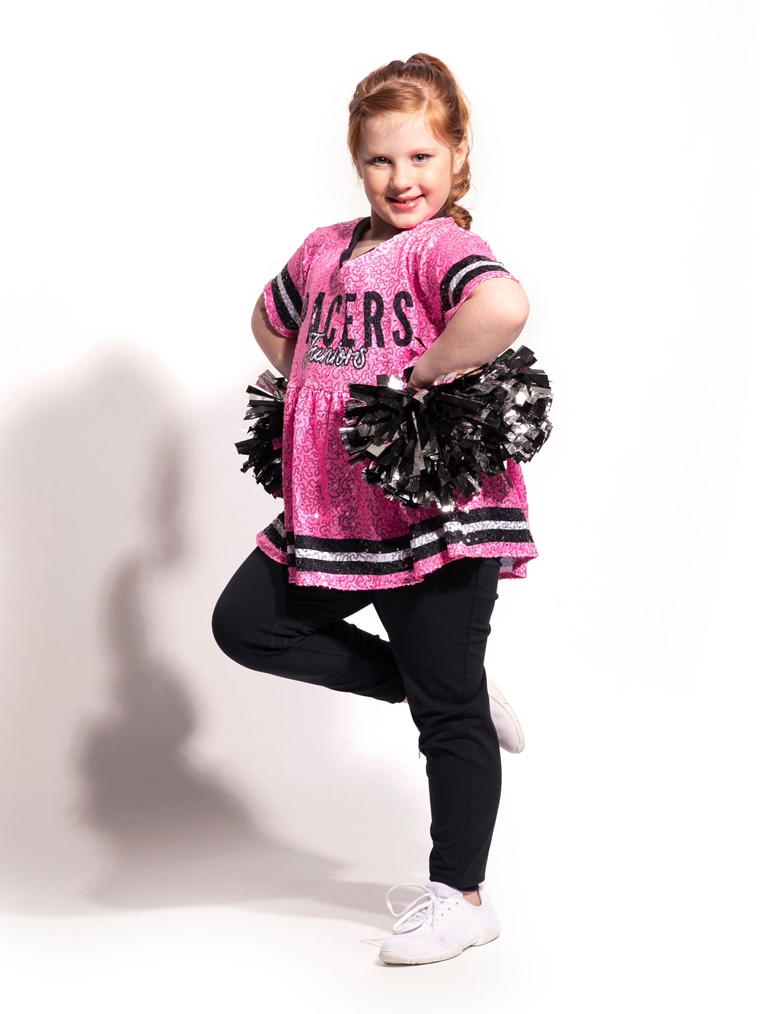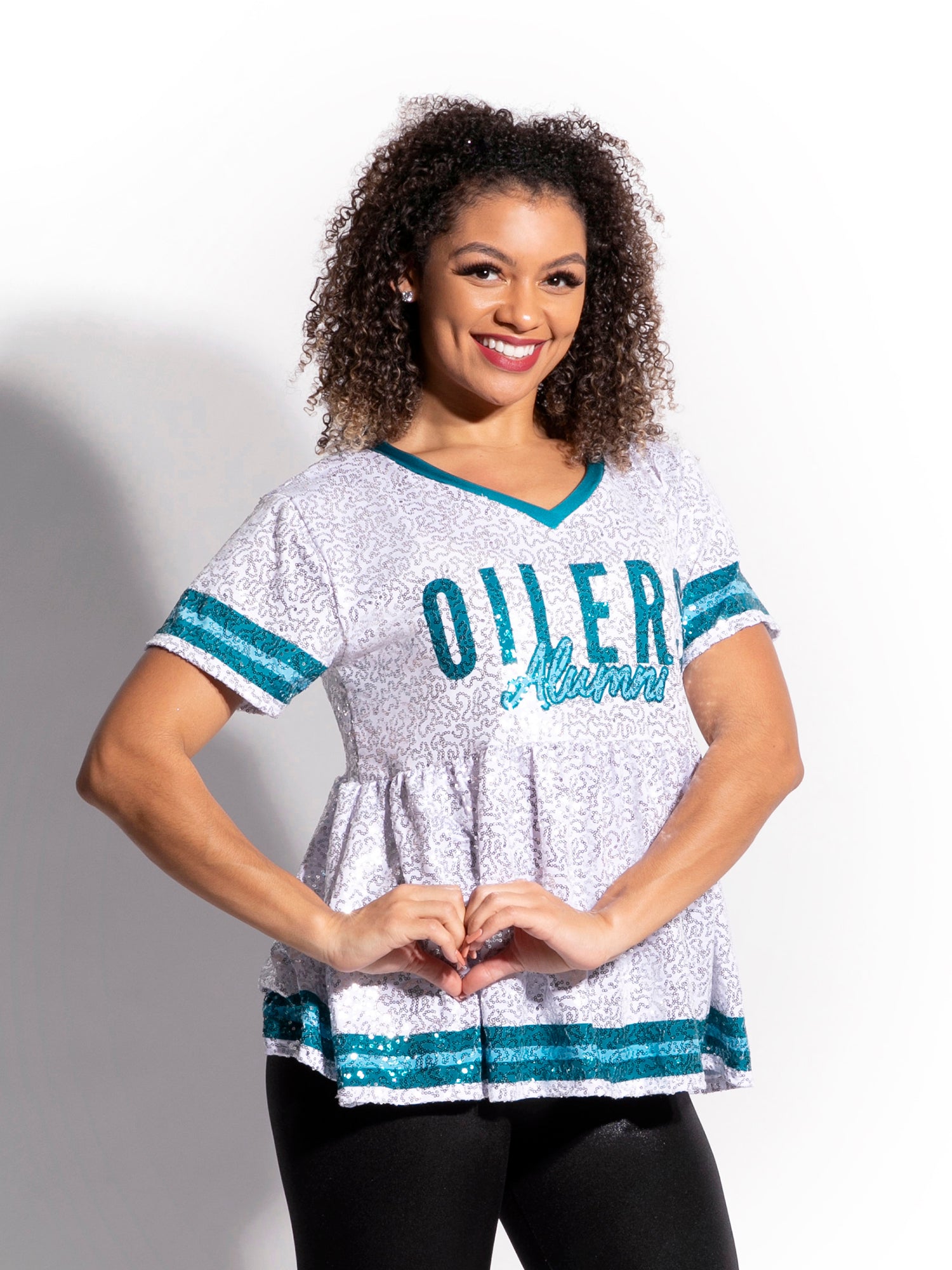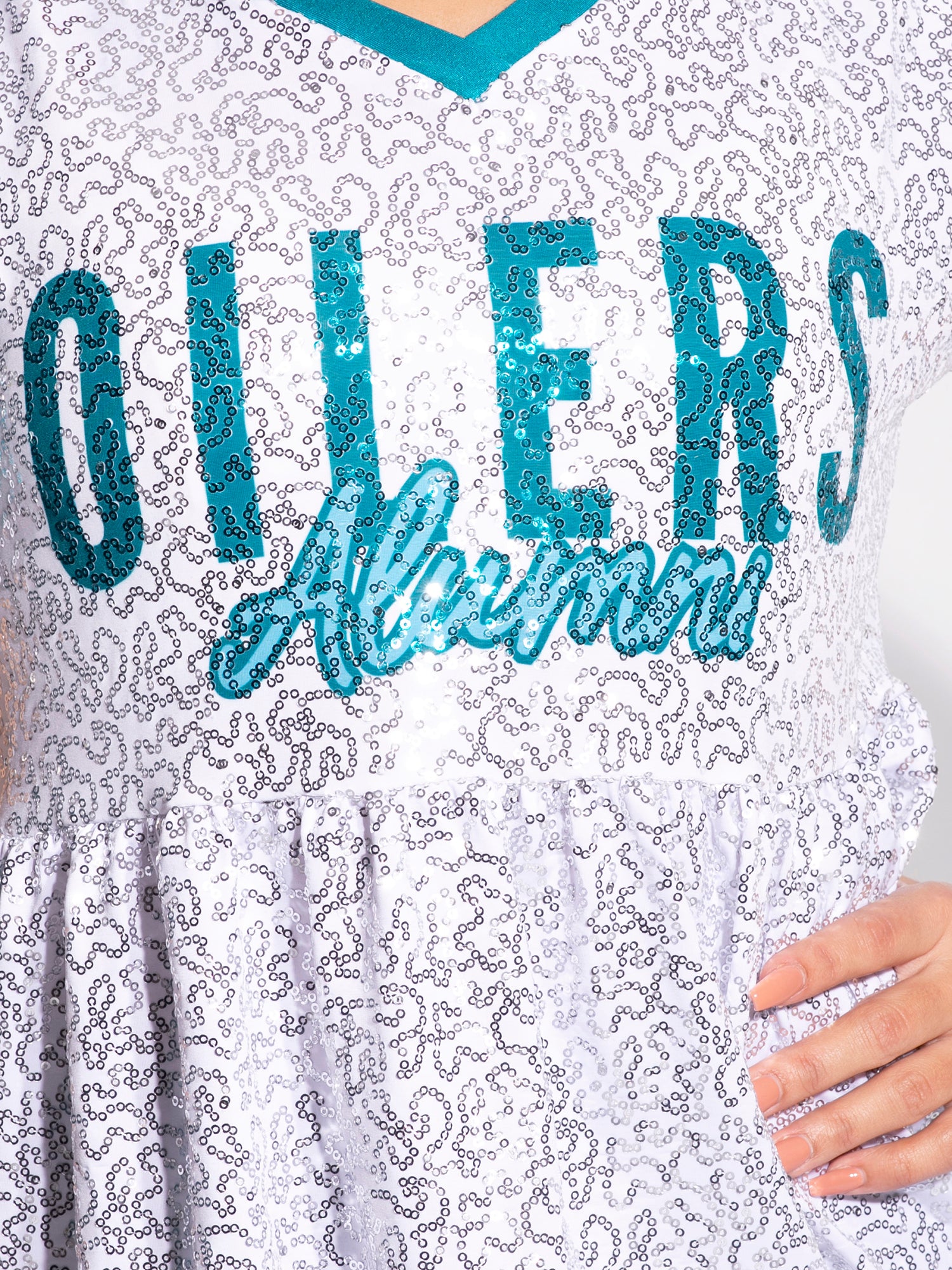 - Fully sublimated loose fit V-neck top with gathers at the waist in sparkle Gaga fabric