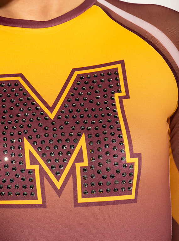 - Sporty Gameday & pom dress with ombre bodice and strappy back, inspired by the University of Minnesota’s National Championship-winning pom dress