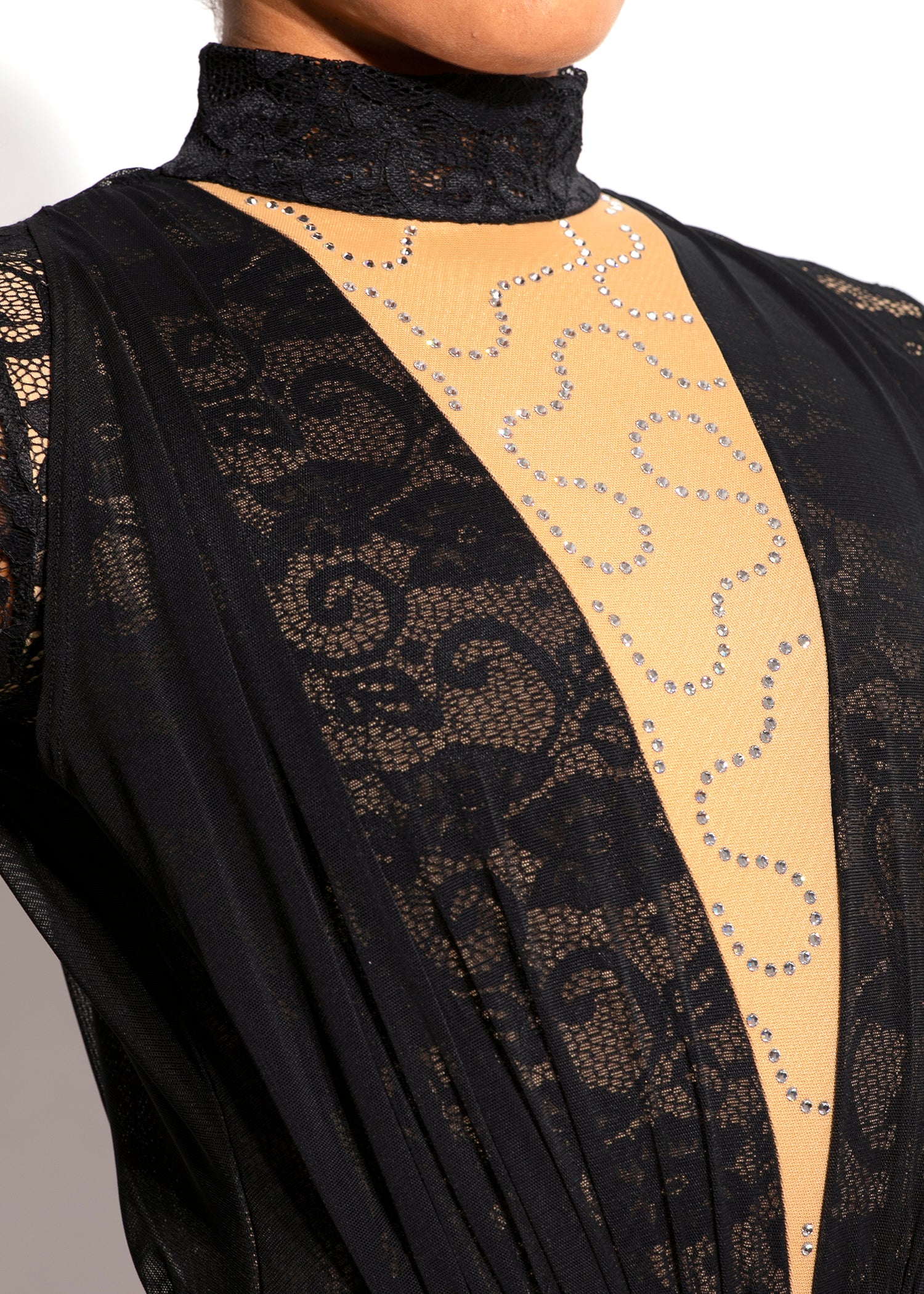 - Long sleeve lace leotard with ruched mesh bodice and velvet brief