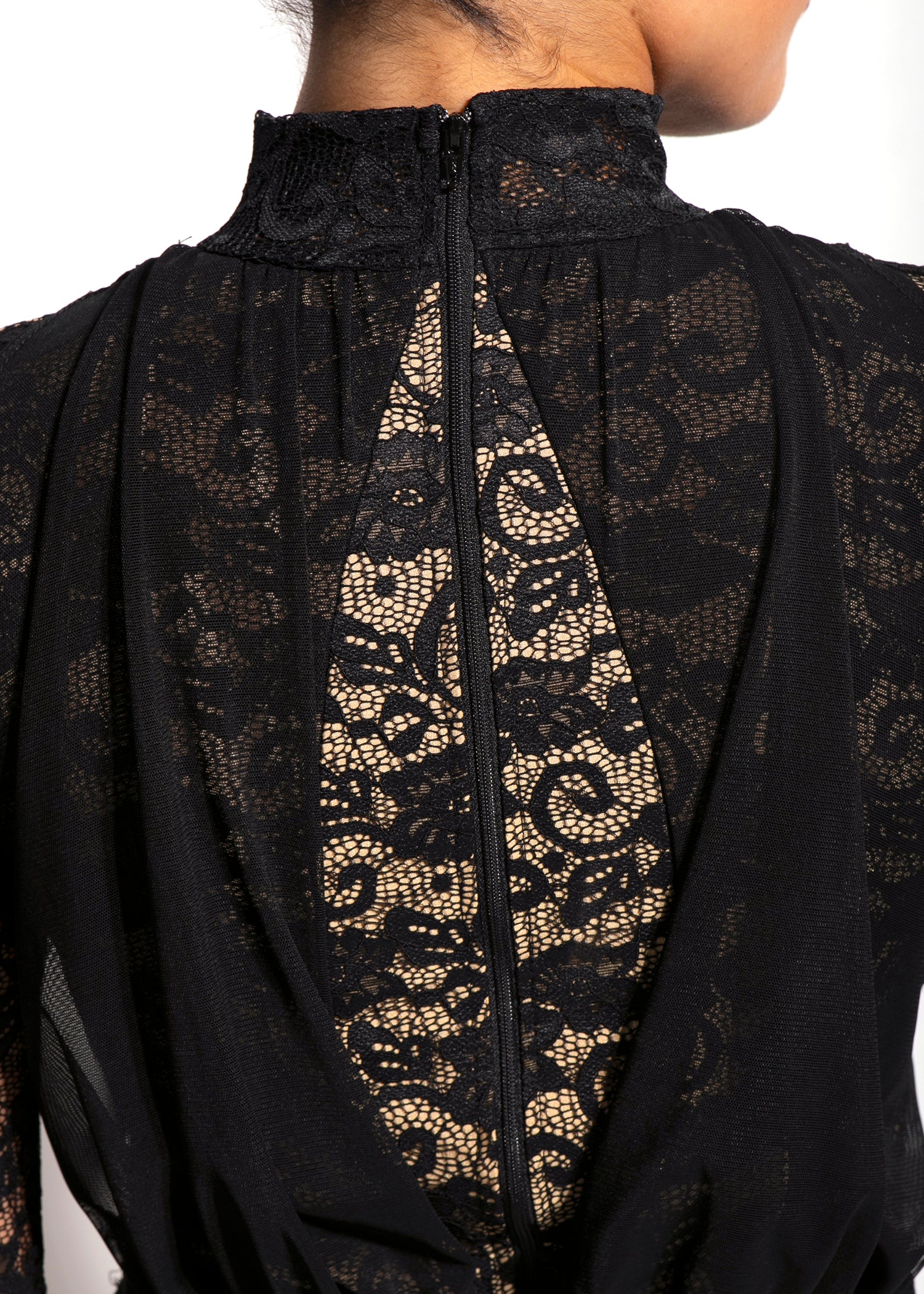 - Lace on bodice is overlayed with gathered mesh