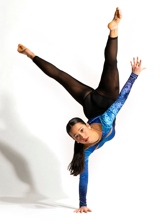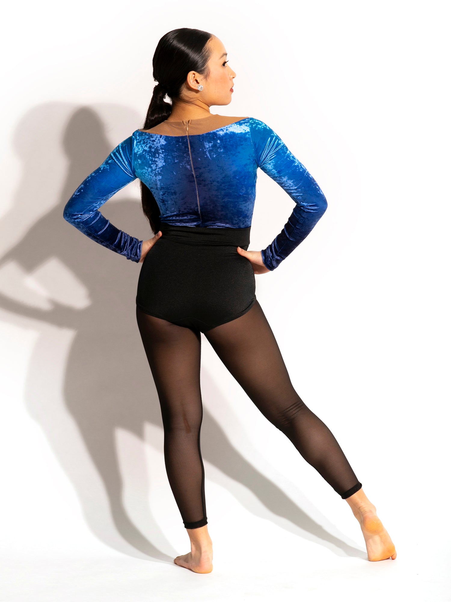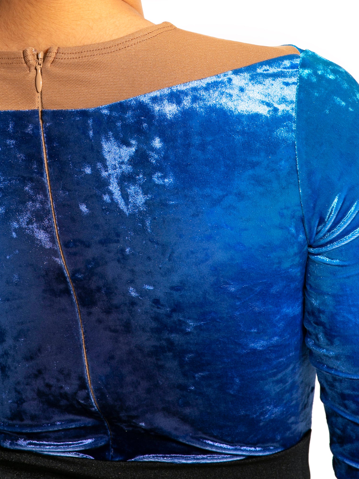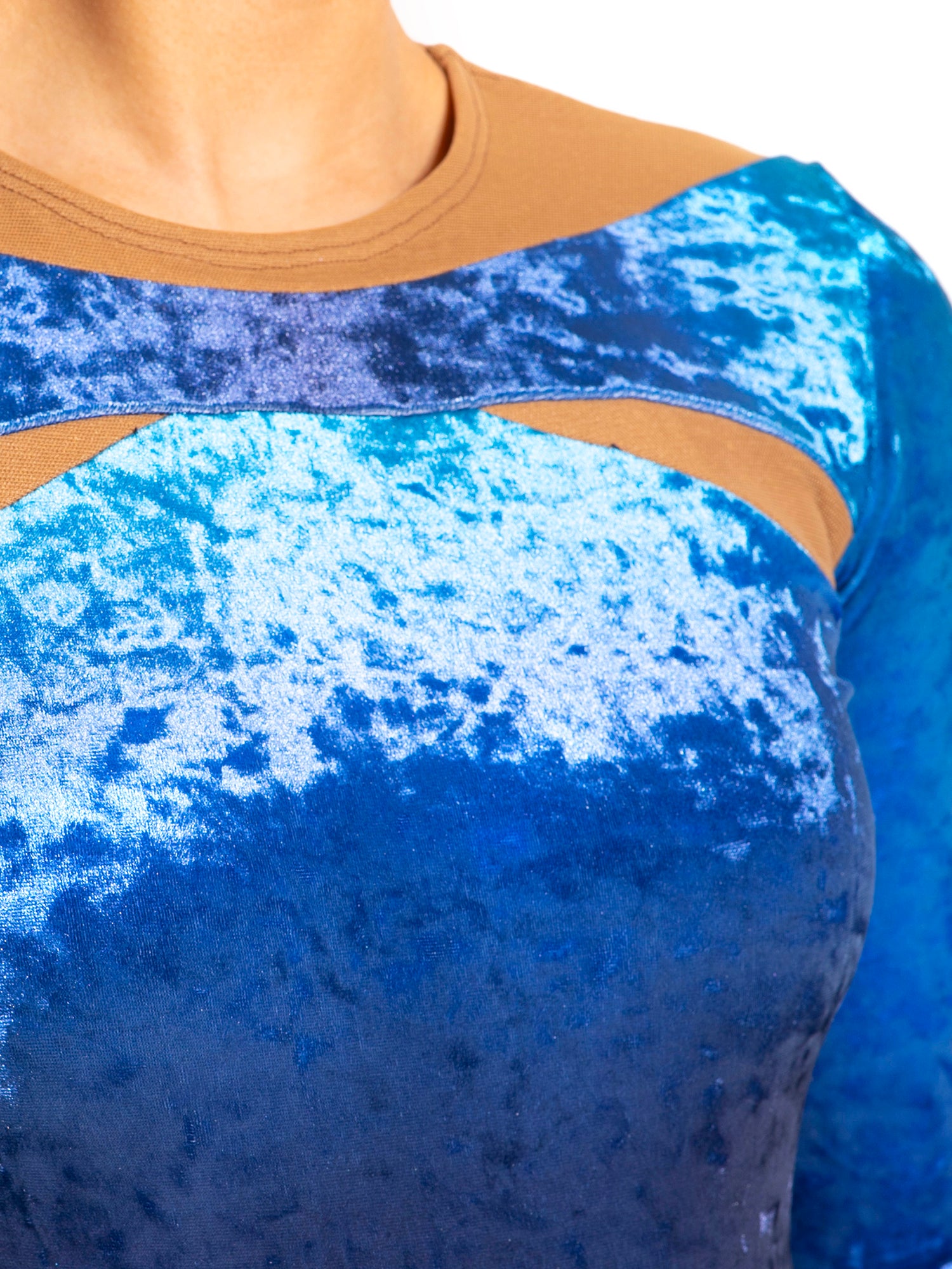- Striking sublimated crushed velvet long sleeve leotard with blocking.