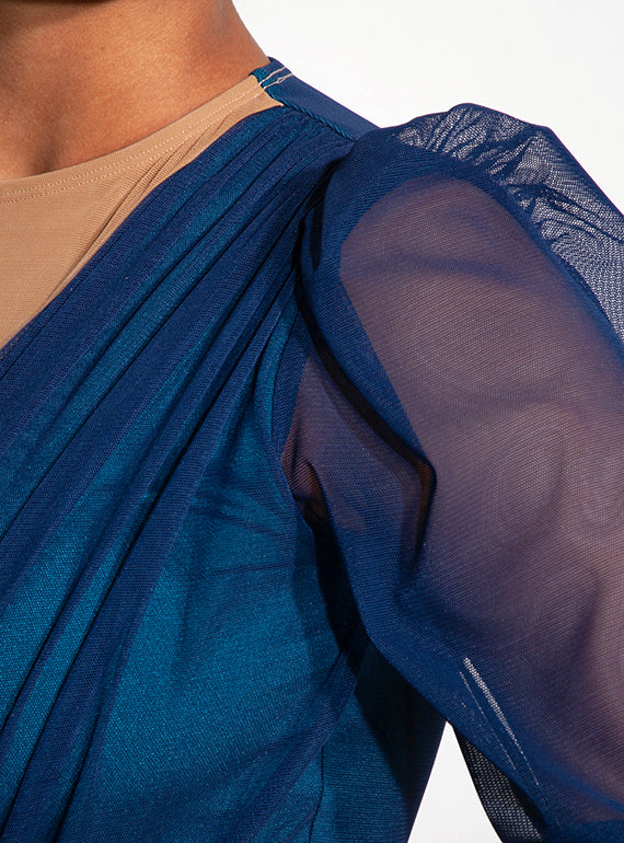 - Romantic dance leotard with mesh ruching, puff sleeves with cuffs, and a velvet brief