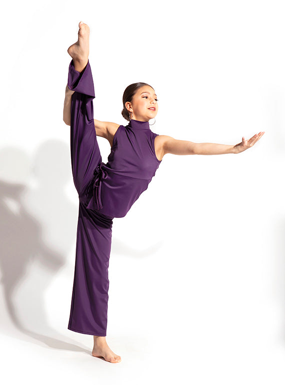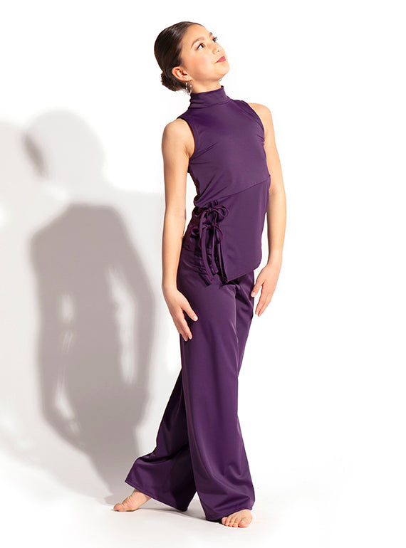 - Modern mock neck sleeveless top with and angled seam across the bodice and two ties