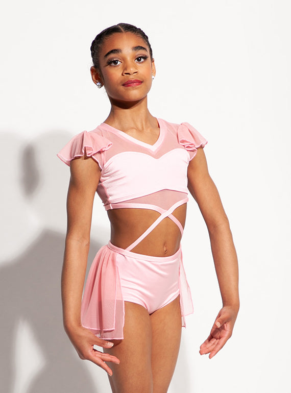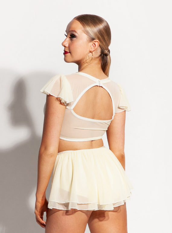 - Two-piece dance set with flutter sleeve top & ruffle skirted brief
