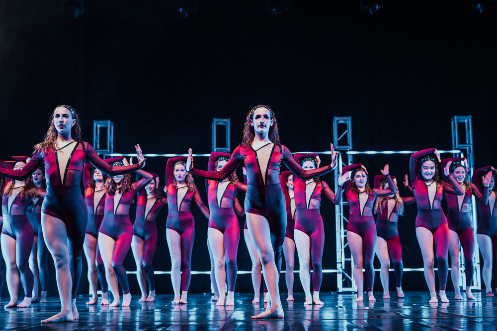 - Dramatic dance unitard with geometric blocking and mesh accents
