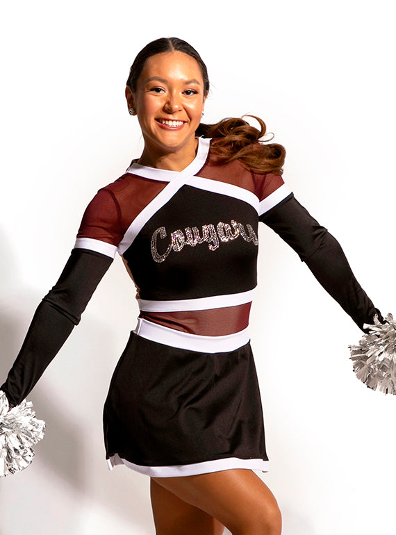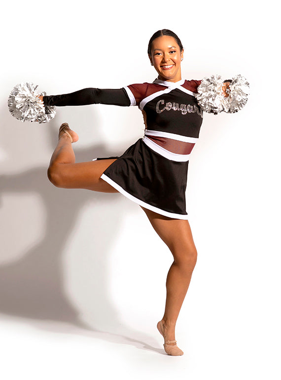 - High neck pom dress with mesh and trim blocking and add on rhinestone lettering
