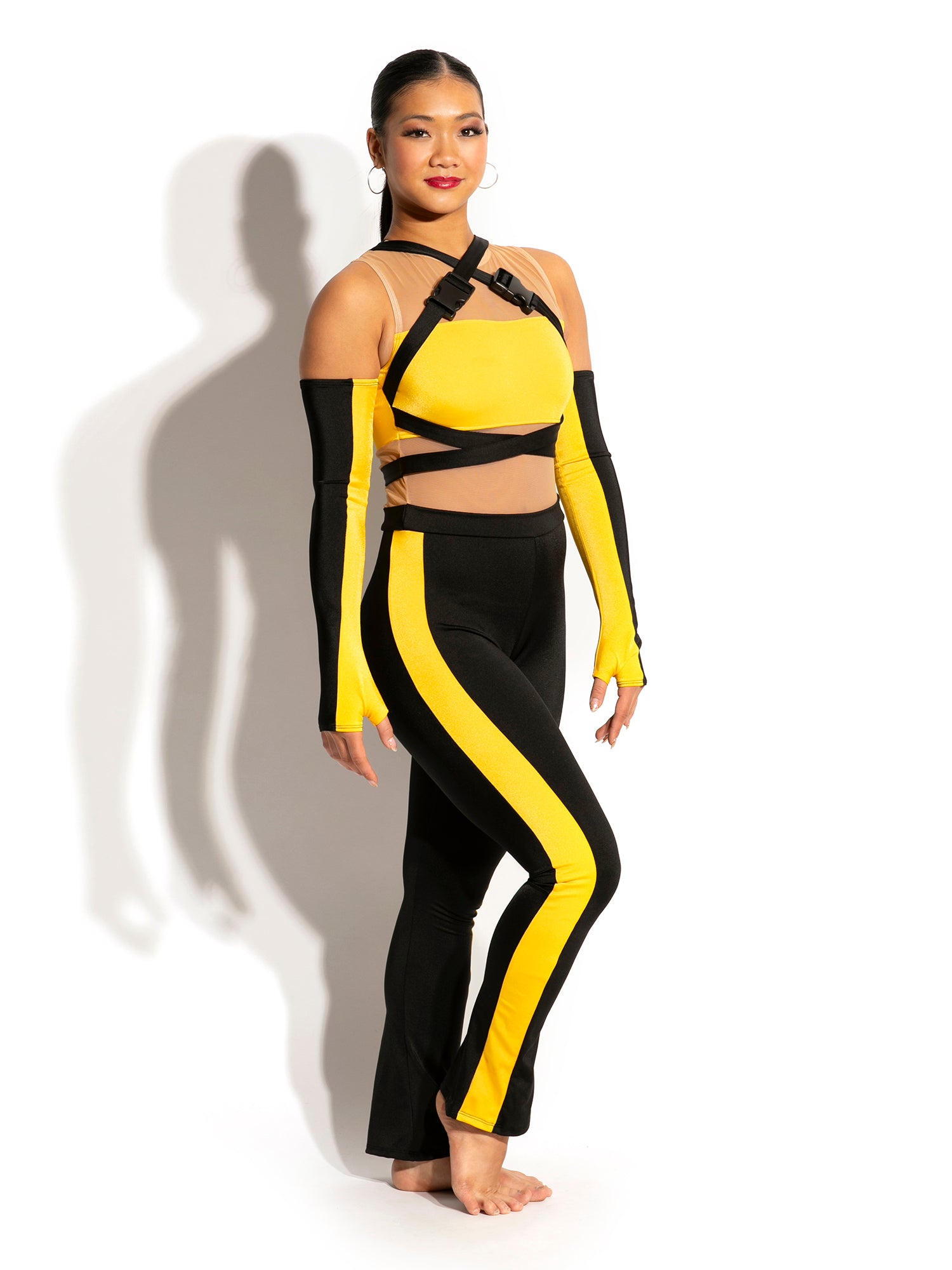 - Edgy sleeveless unitard with buckle straps and color blocking inspired by Midland University Dance Team