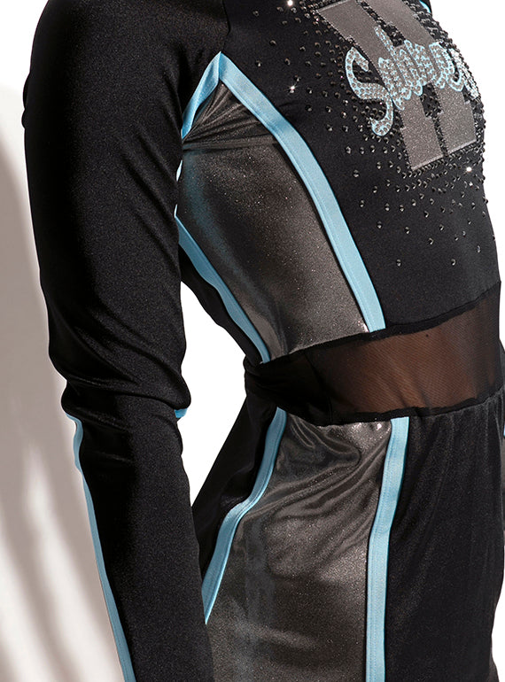 - Pom dress with a mesh insert and color blocking with add on rhinestones
