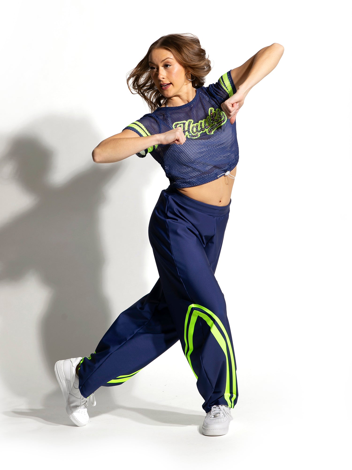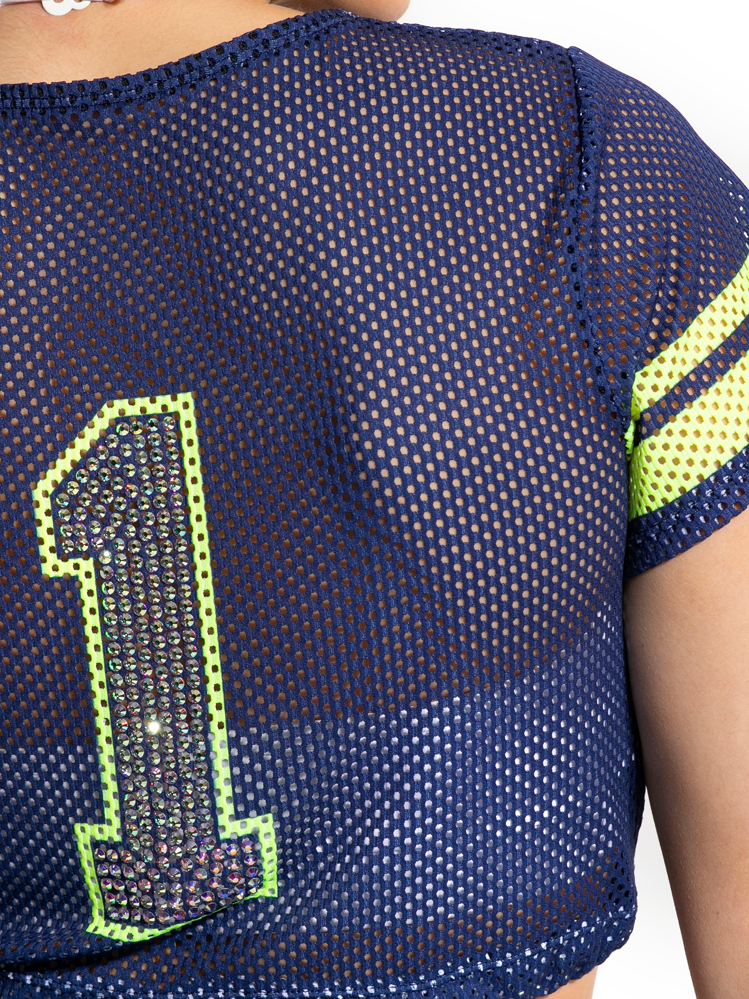 - Sporty jersey inspired sublimated pop mesh overlay with a drawstring hem and add-on rhinestones