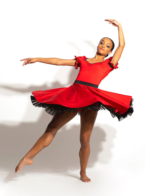 - Vintage inspired short sleeve dress with full skirt and mesh ruffle