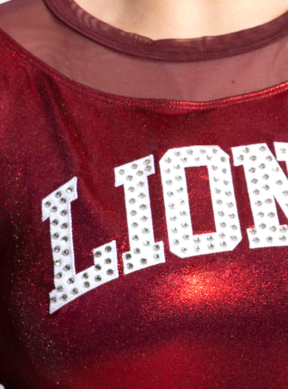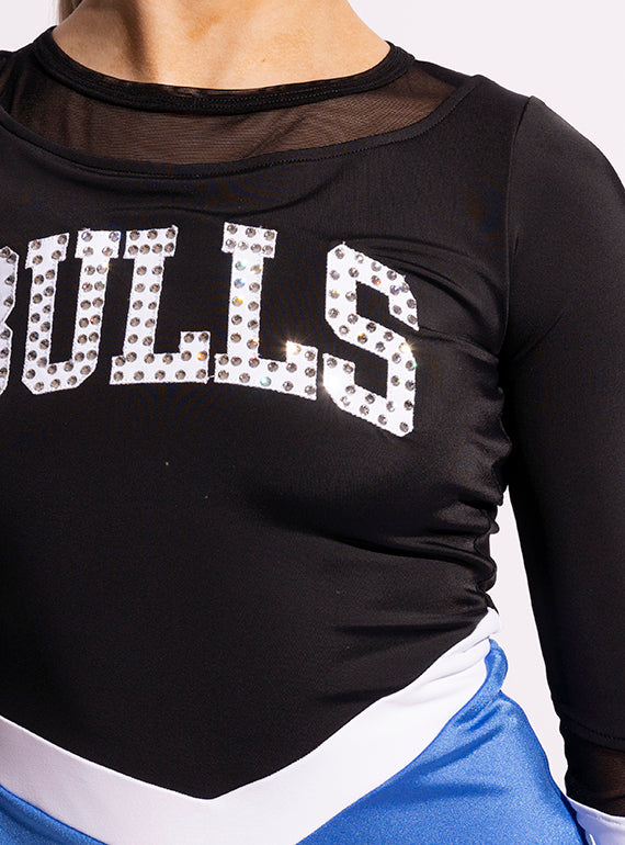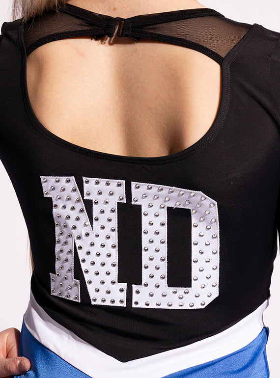 - Game Day & pom dress with mesh accents, V-shaped style lines, and large lettering on the back