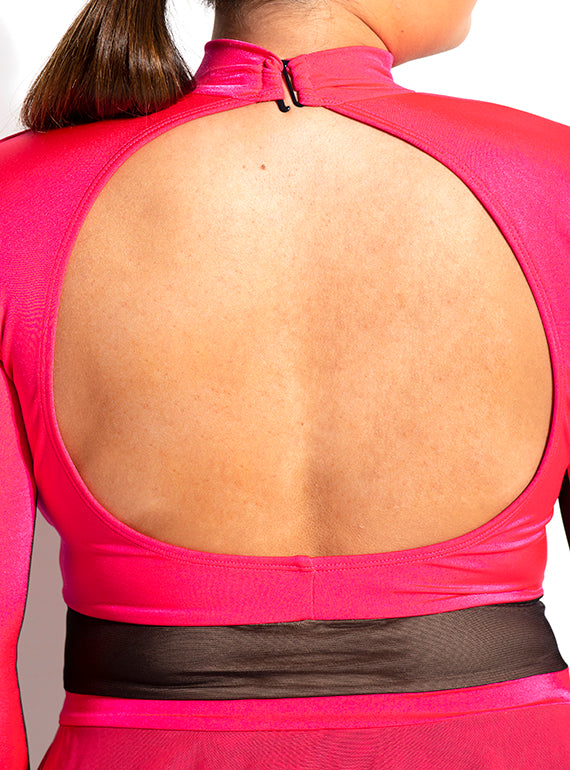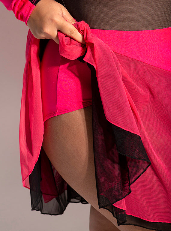 - Skate dress with dynamic blocking, open back, and cascade skirt