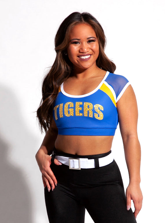- Sublimated sporty gameday crop with mesh cap sleeves