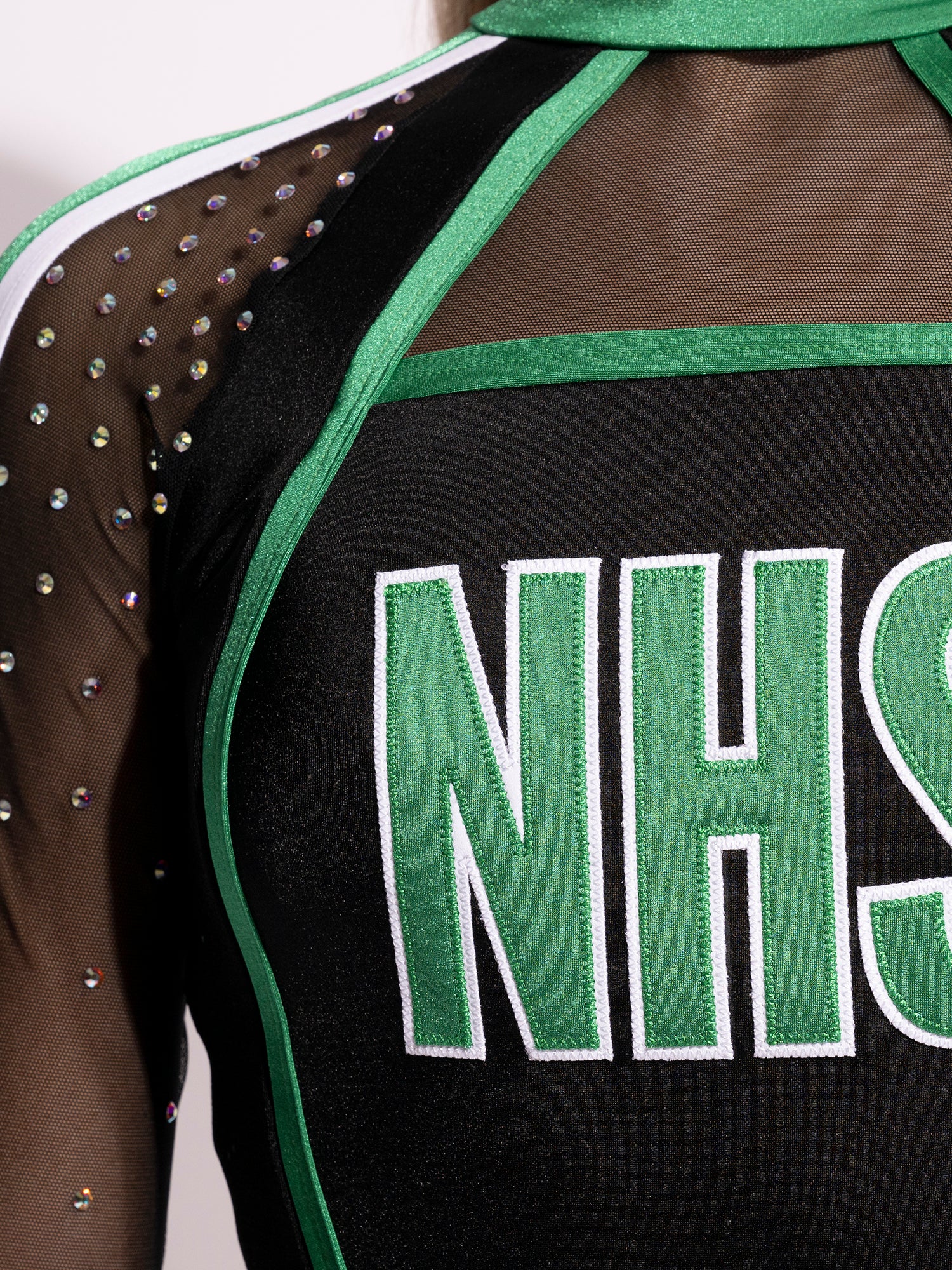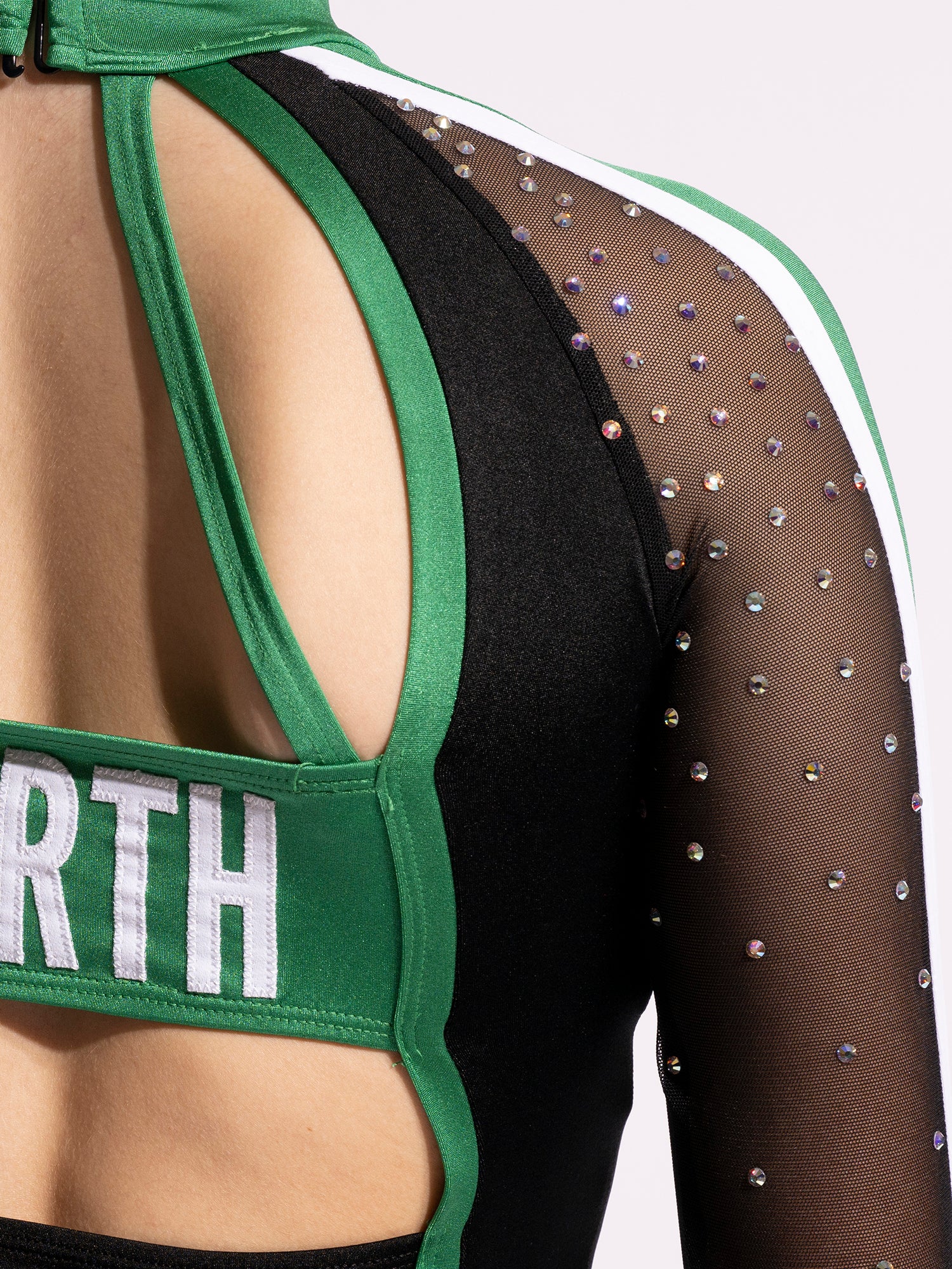 - Gameday & pom dress with mock neck, keyhole neckline, and open back