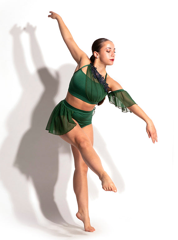 - Flowing high waisted asymmetrical mesh skirt