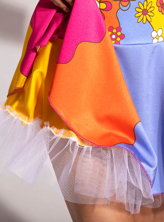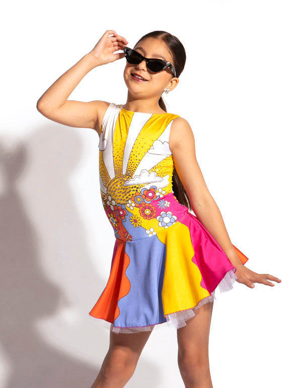 - Retro sublimated sunset printed skate dress with crinoline underskirt and add on rhinestones