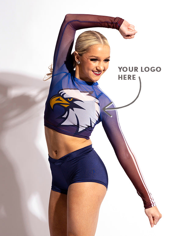 - Long sleeve ombre mesh crop top overlay with custom sublimation logo and keyhole back opening